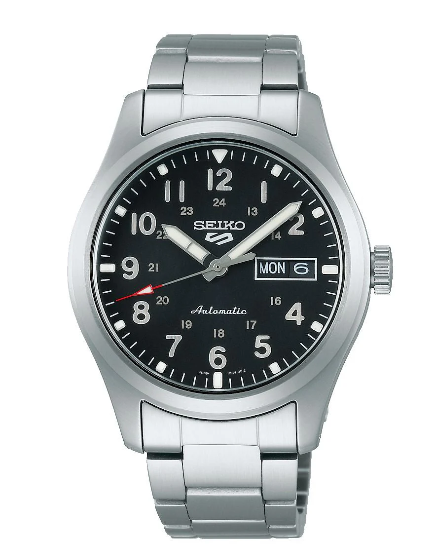 The Seiko Military Black Dial Automatic Watch SRPG27K is a refined men’s watch that celebrates mechanical excellence and timeless style. Crafted from durable stainless steel, it features a 39.4mm case and brushed silver bracelet that exude understated strength. The sleek black dial is accented with luminous hands and markers for high legibility, complemented by a day-date complication and red-accented second hand for a touch of modern flair. Powered by Seiko’s reliable 4R36 automatic movement with manual winding capability, it offers a 41-hour power reserve and a transparent case back displaying its 24-jewel mechanism. Designed for everyday versatility, this timepiece is water-resistant up to 100 meters and protected by Hardlex crystal glass. With military-inspired aesthetics and the craftsmanship of the renowned Seiko 5 series, this casual yet sporty watch stands out in its category for functionality, heritage, and enduring appeal.