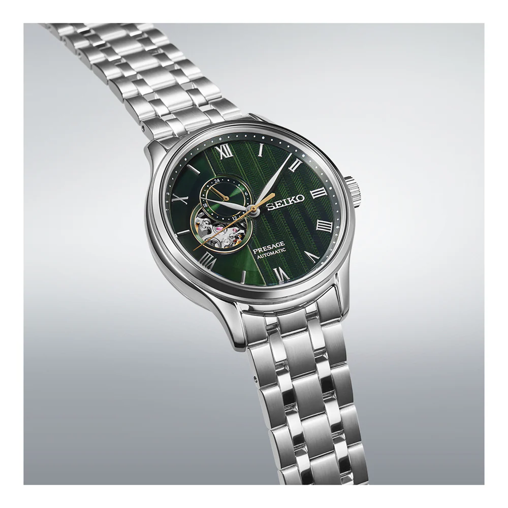 The Seiko Presage Green Dial Japanese Garden Open Heart men’s watch brings refined elegance to any occasion. Featuring a rich green textured dial inspired by serene Japanese gardens, this timepiece showcases meticulous craftsmanship through its open-heart display and polished stainless steel case and bracelet. The high-quality sapphire crystal ensures enduring clarity, while the automatic movement offers a 41-hour power reserve and precise timekeeping. Roman numeral hour markers and a sleek 41.8mm case diameter enhance the watch’s sophisticated appeal, making it perfect for both everyday refinement and special moments. Water resistance to 30 meters and the trusted Seiko legacy complete this exceptional piece in the watches category.
