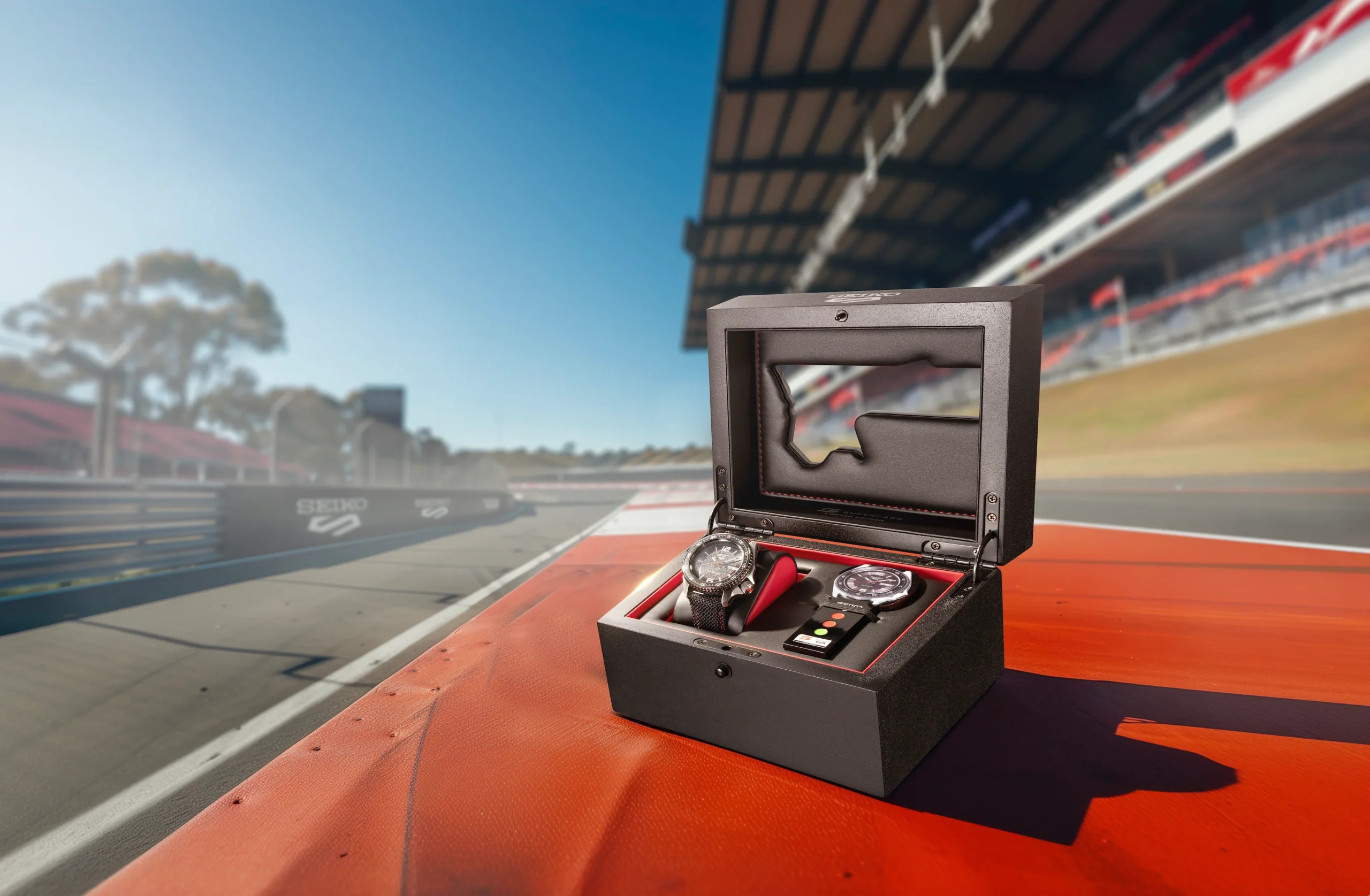 Designed for everyday wear with a nod to high-octane style, it includes a black nylon strap with red stitching accents, Hardlex crystal for added durability, and 100 meters of water resistance. This exclusive timepiece arrives in a collector’s box featuring a Mount Panorama track map, making it a standout in the sport and limited edition watch category. A true collector’s piece for those who appreciate precision, style, and speed.