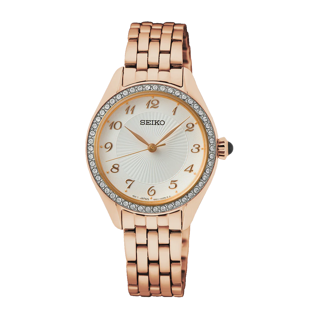 Whether you are attending a business meeting, enjoying an evening out, or simply appreciating the artistry of a well-made watch, the Seiko Swarovski Crystal Rose Gold Watch SUR396P is a companion that enhances every moment. Its graceful design and exceptional craftsmanship make it a treasured piece that will remain a favorite in your collection for years to come.