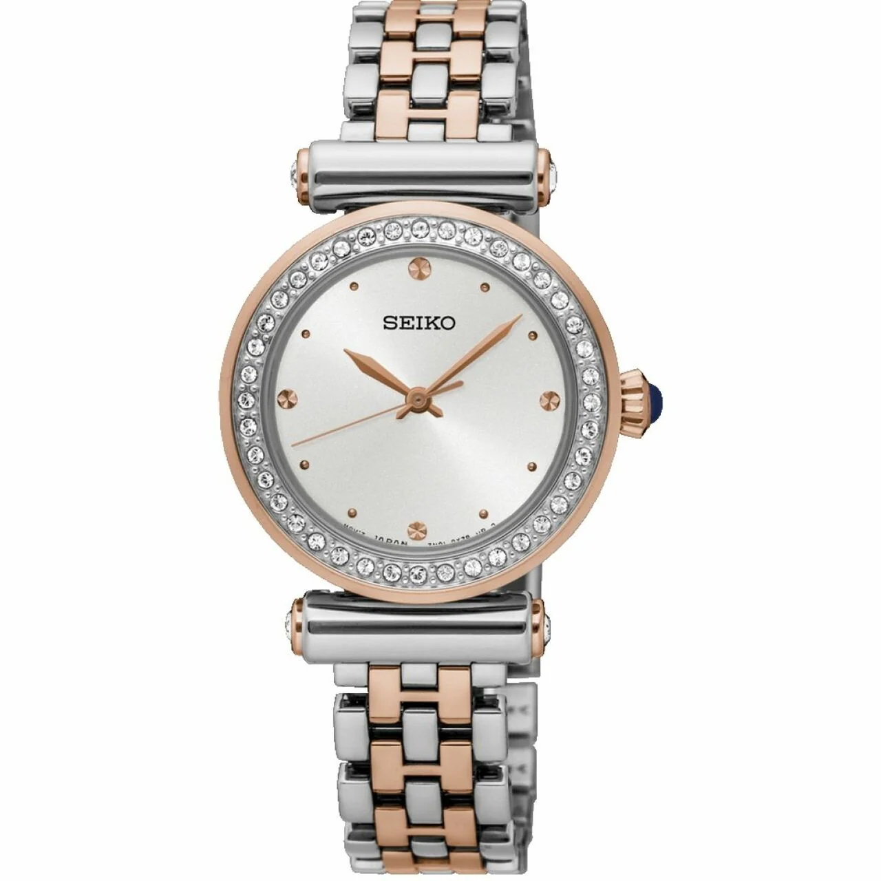 Experience the epitome of elegance and precision with the Seiko Swarovski Crystals Ladies Dress Watch SRZ466P, a timepiece that seamlessly blends classic sophistication with modern styling. This exquisite watch features a harmonious combination of rose gold and silver tones, crafted in a stainless steel bracelet that exudes understated luxury. Whether you’re attending a formal event or simply navigating your daily schedule, this watch is designed to complement your every look, transitioning effortlessly from day to night.
