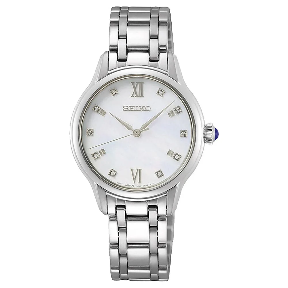 Seiko SRZ537P1 women’s watch with sapphire glass and diamond 29.5 mm. The watch is equipped with sapphire glass that is virtually indestructible and has a chic Cabochon button.