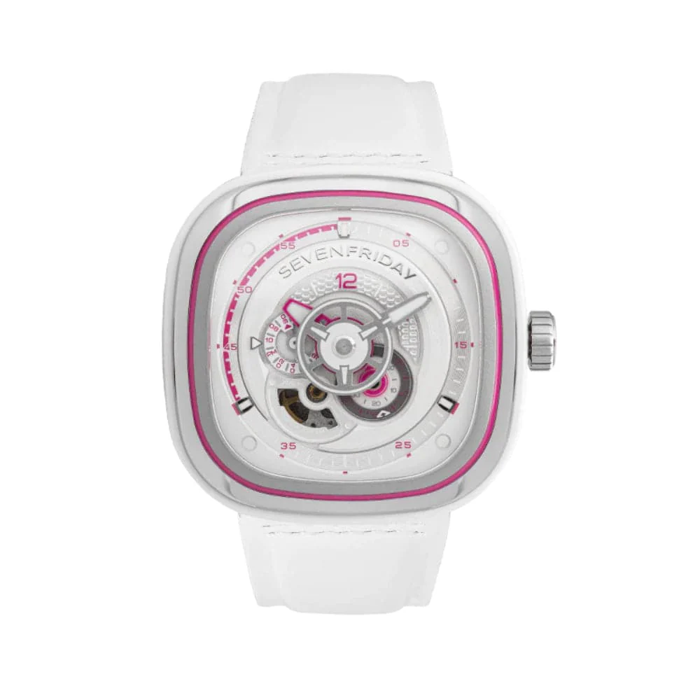 The stainless-steel bezel surrounded by a solid white animation ring, softened in its center by a translucent acetate, a bio plastic material you will normally find in our Sunnies! The turquoise (for the P3C/10) and Lipstick pink (for the P3C/12) accents continue on our signature 4-level dial, from 40 to 60 on the minute ring, at 12, on the hour hand, AM/PM and seconds disks, with a final colorful dab on the crown!