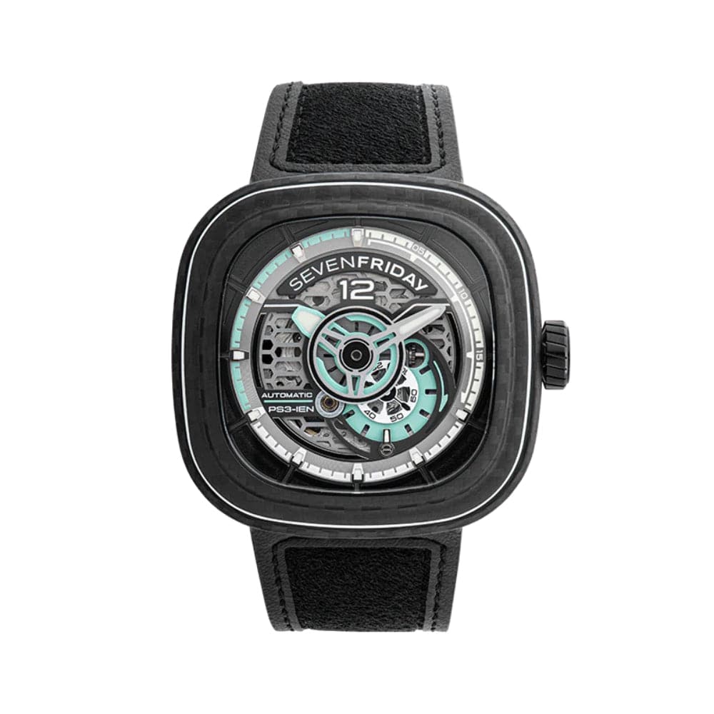 And so, it is for our new PS3/02 “RED”. SEVENFRIDAY’s 5th carbon iteration is in our distinctive TV shape wrapped in black carbon fiber, with a subtle white resin highlight on the bezel and a matching 7F logo on the crown.
