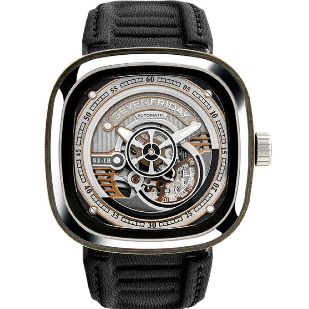 Stainless steel case with a black leather strap. Fixed silver-tone bezel. Silver (cut-out) dial with luminous silver-tone hands and index hour markers. Arabic numeral minute markers (at 5-minute intervals). Minute markers around the outer rim. Dial Type: Analog. Luminescent hands and markers. Small seconds sub-dial. Miyota caliber 82S5 automatic movement, containing 21 Jewels, bitting at 21600 vph, and has a power reserve of approximately 42 hours. Scratch-resistant mineral crystal. Solid case back. Square case shape. Case dimensions: 47 mm x 47.6 mm. Bandwidth: 28 mm. Tang clasp. Water-resistant at 30 meters / 100 feet. Functions: hour, minute, small second. S-series Series. Casual watch style. Sevenfriday S-series Automatic Silver Dial Men’s Watch S2/01.