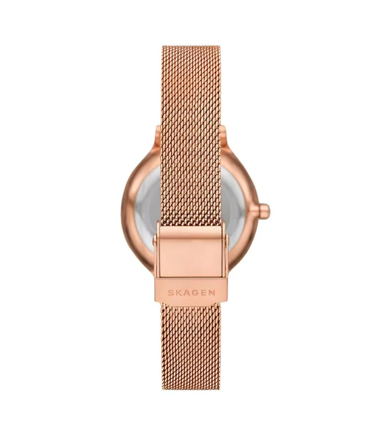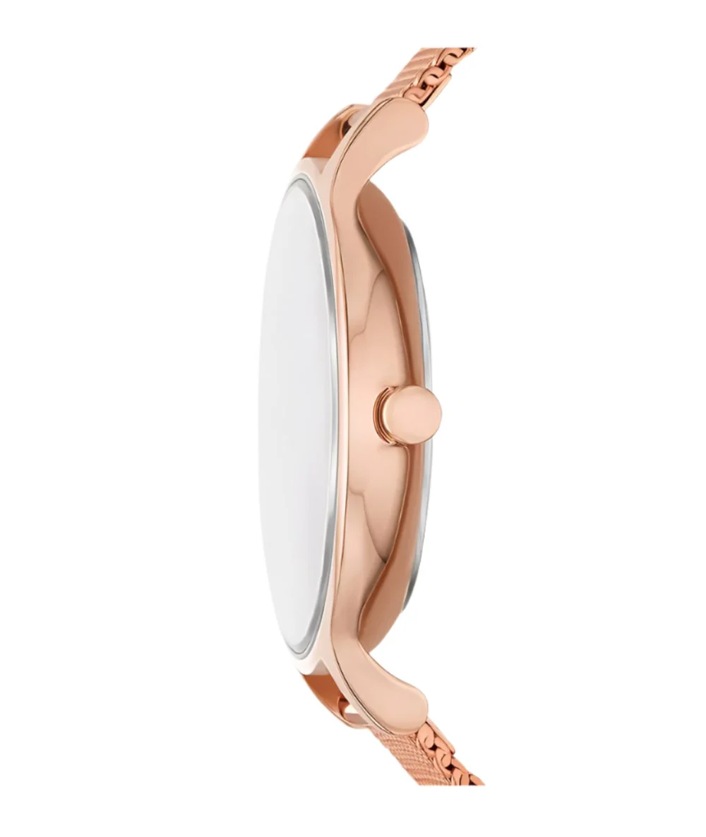 The Skagen Anita watch is a testament to superior craftsmanship, promising both durability and precision. The meticulously crafted rose gold mesh band is not just a feast for the eyes but also a testament to the meticulous attention to detail that Skagen is renowned for. The finely woven stainless steel mesh wraps comfortably around your wrist, providing a secure fit that does not compromise on elegance. Measuring approximately 22 centimeters in length, the band is designed to accommodate a variety of wrist sizes with grace.