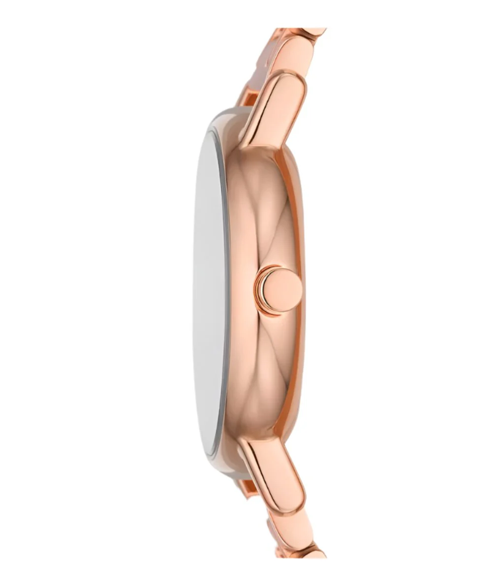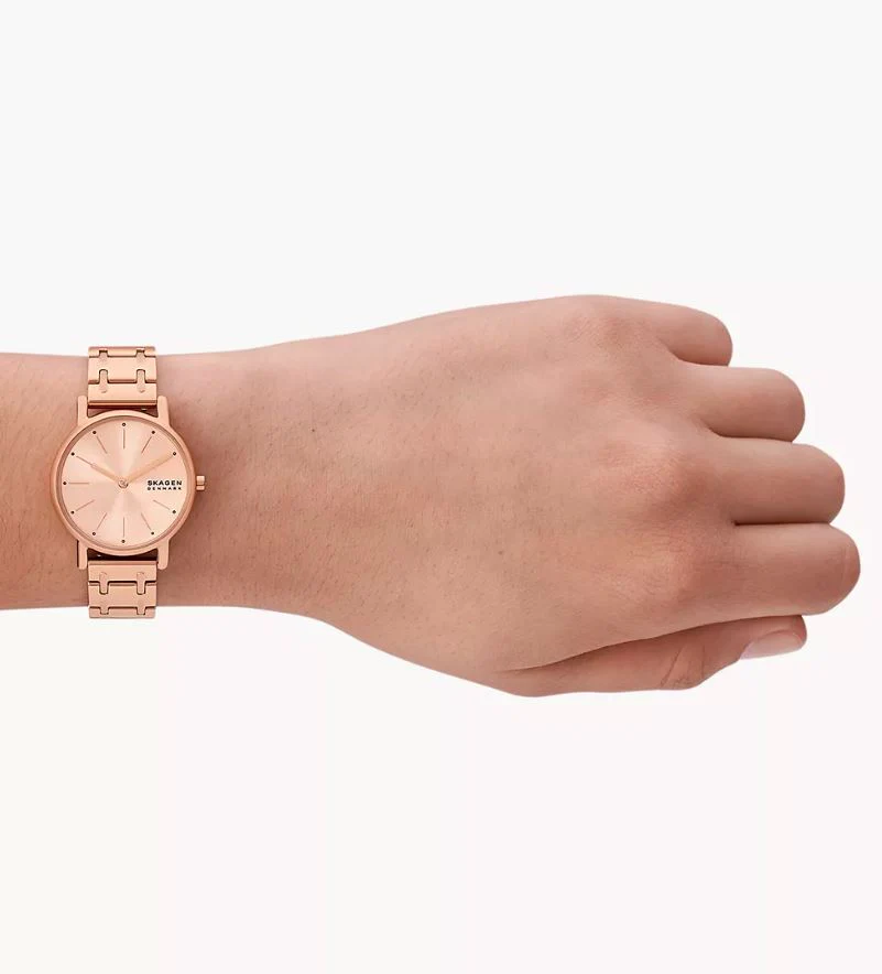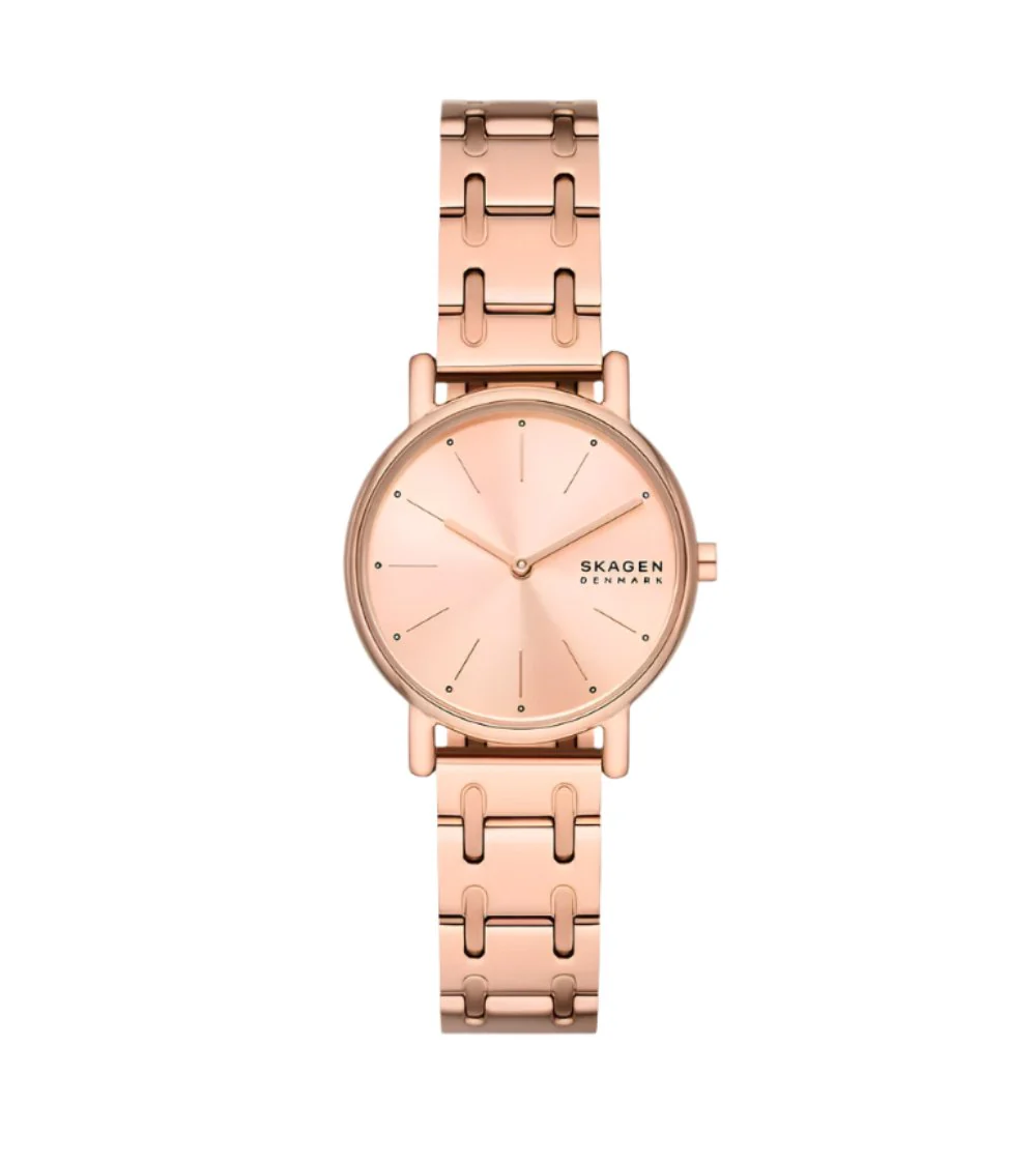 Refined and modern, the Skagen Signatur Lille women’s watch exudes effortless elegance with its minimalist Scandinavian design. Crafted from rose gold stainless steel, this timepiece features a 30mm case and a slender 14mm bracelet that sits lightly on the wrist. The rose gold dial, framed by a polished case, offers a clean quartz two-hand movement under durable mineral crystal glass. Designed for both style and resilience, it is water-resistant up to 50 meters and secured with a sleek foldover clasp. A standout in the women’s watch category, it seamlessly balances durability with aesthetic poise, making it the perfect complement to any ensemble.