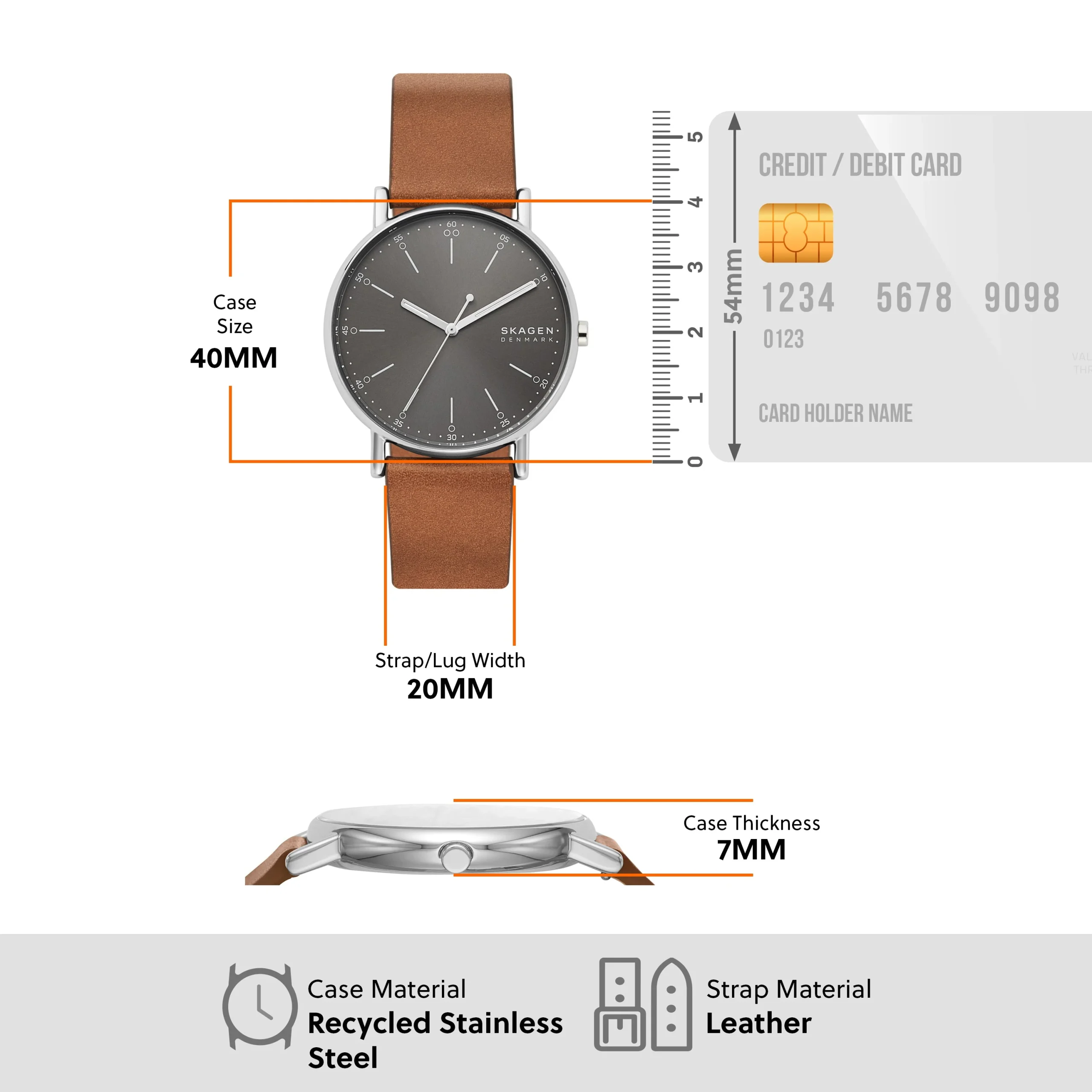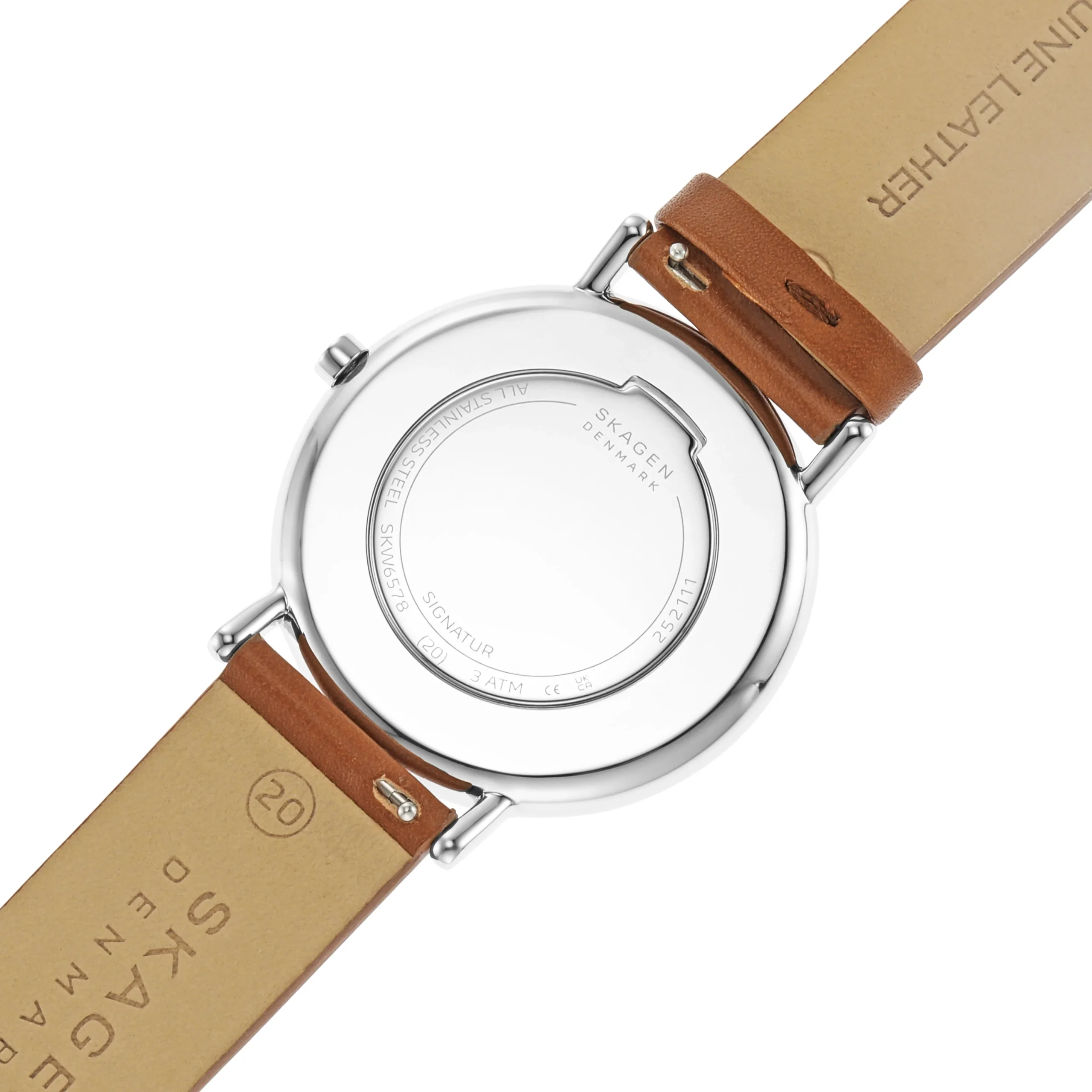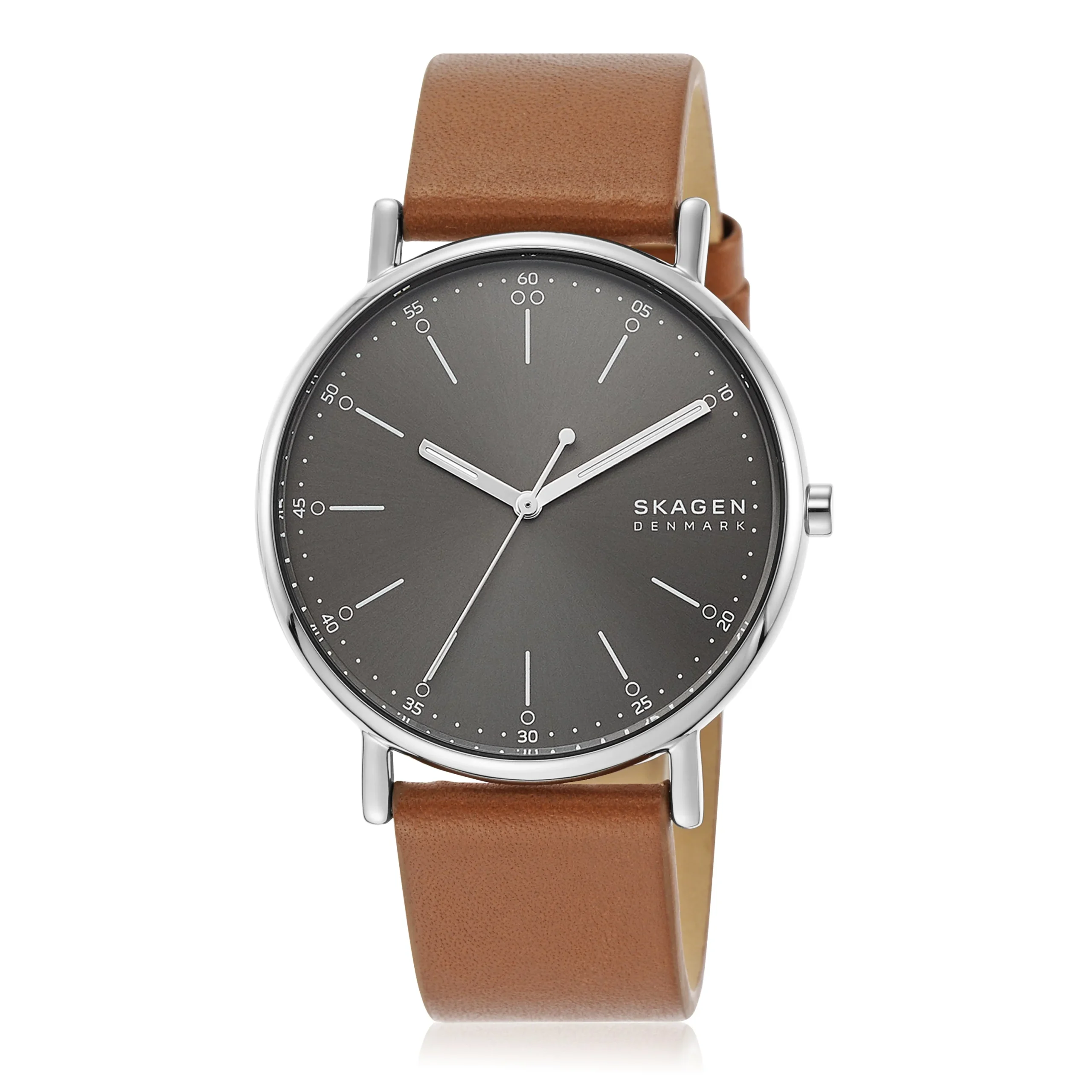 Introducing the Skagen Signatur Men’s Watch SKW6578, a perfect embodiment of modern sophistication and timeless craftsmanship. This elegant timepiece features a striking 40mm circular case, adorned with a sleek grey dial that seamlessly complements the rich brown leather strap. Designed for versatility, this men’s watch effortlessly transitions from casual to dressy occasions. The quartz movement ensures impeccable timekeeping, while its water resistance of up to 30 meters adds durability for daily wear. Crafted with at least 50% recycled stainless steel, the Skagen Signatur not only reflects style but also a commitment to sustainability. Elevate your accessory collection with this refined piece that marries form and function, perfect for the discerning gentleman.