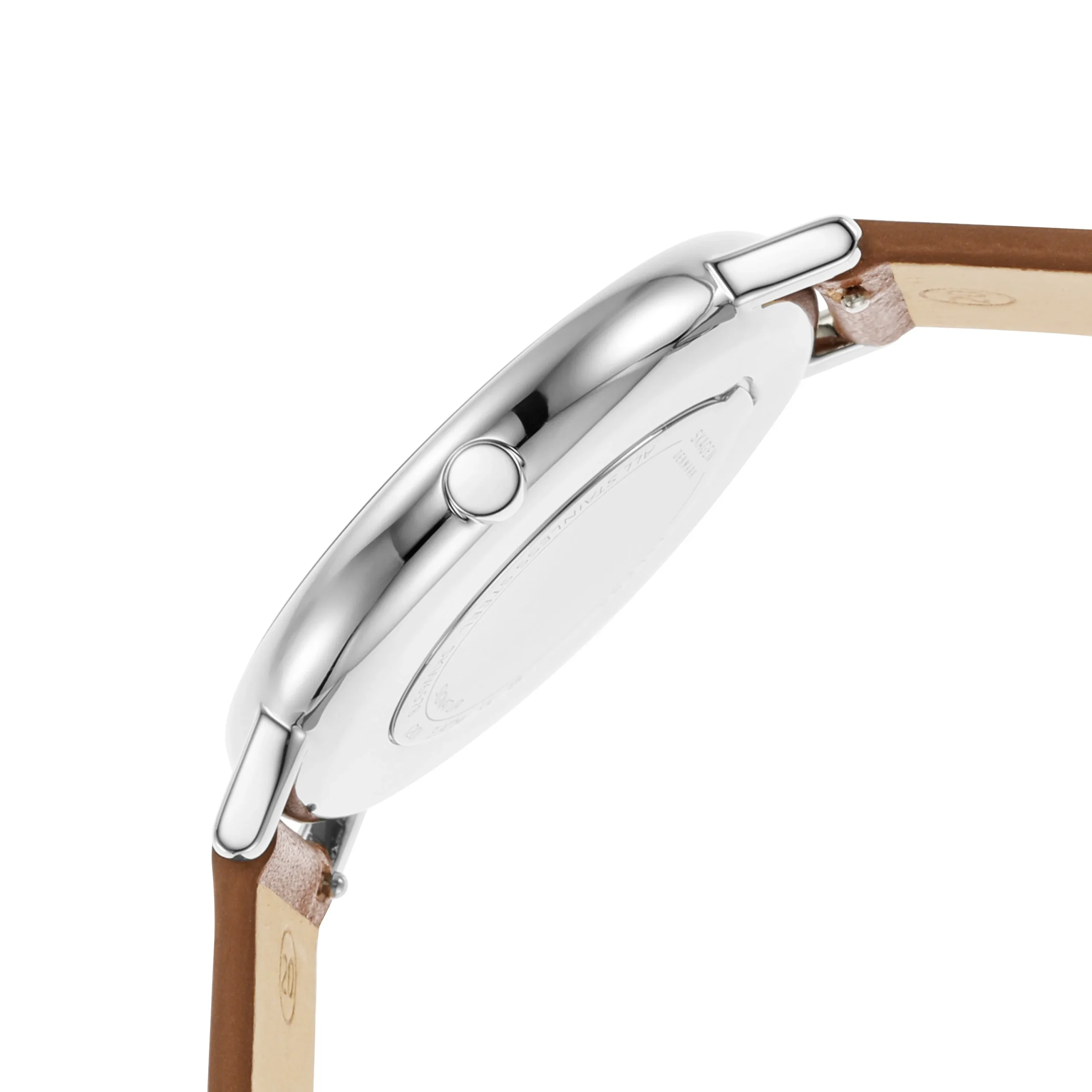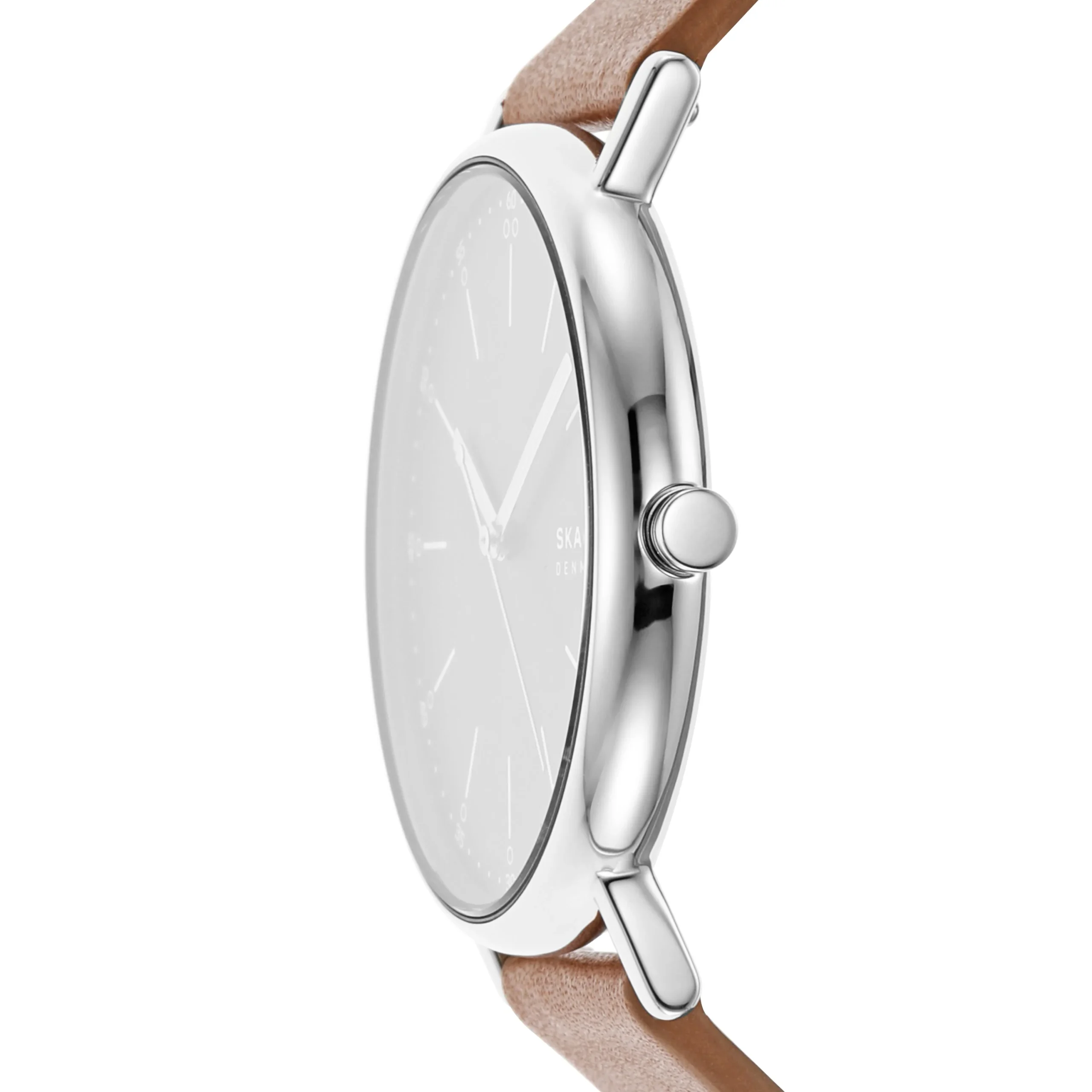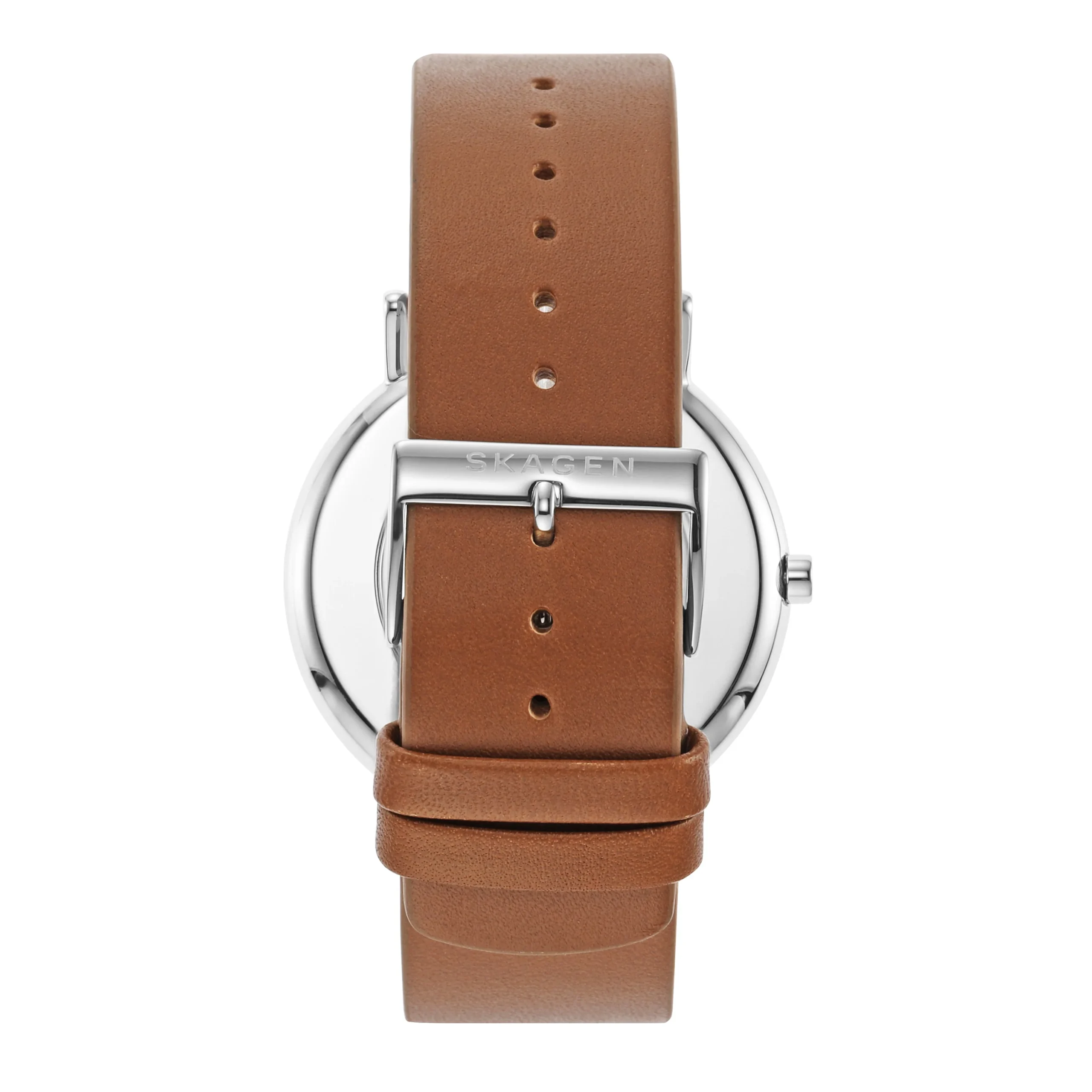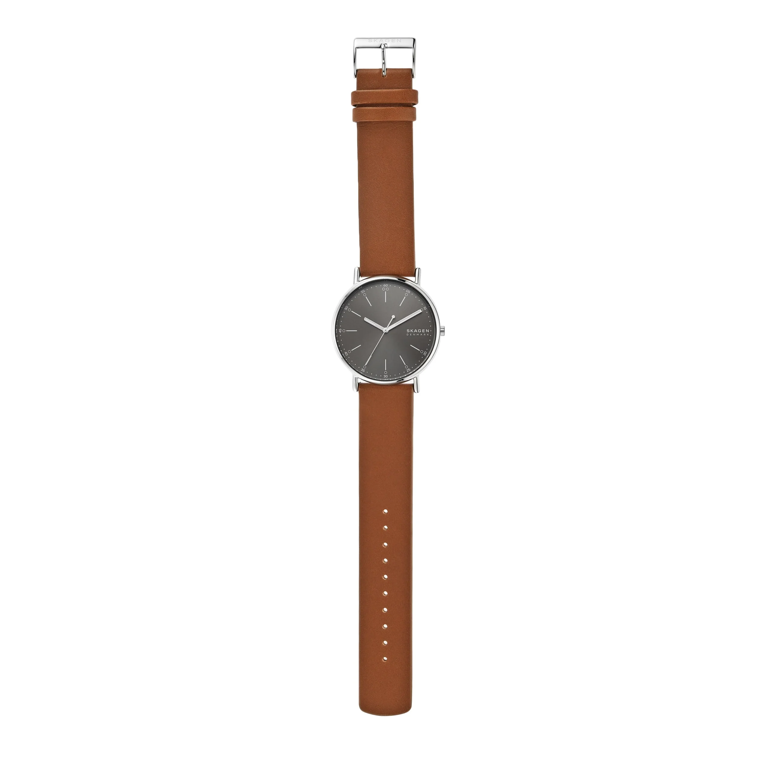 Introducing the Skagen Signatur Men’s Watch SKW6578, a perfect embodiment of modern sophistication and timeless craftsmanship. This elegant timepiece features a striking 40mm circular case, adorned with a sleek grey dial that seamlessly complements the rich brown leather strap. Designed for versatility, this men’s watch effortlessly transitions from casual to dressy occasions. The quartz movement ensures impeccable timekeeping, while its water resistance of up to 30 meters adds durability for daily wear. Crafted with at least 50% recycled stainless steel, the Skagen Signatur not only reflects style but also a commitment to sustainability. Elevate your accessory collection with this refined piece that marries form and function, perfect for the discerning gentleman.