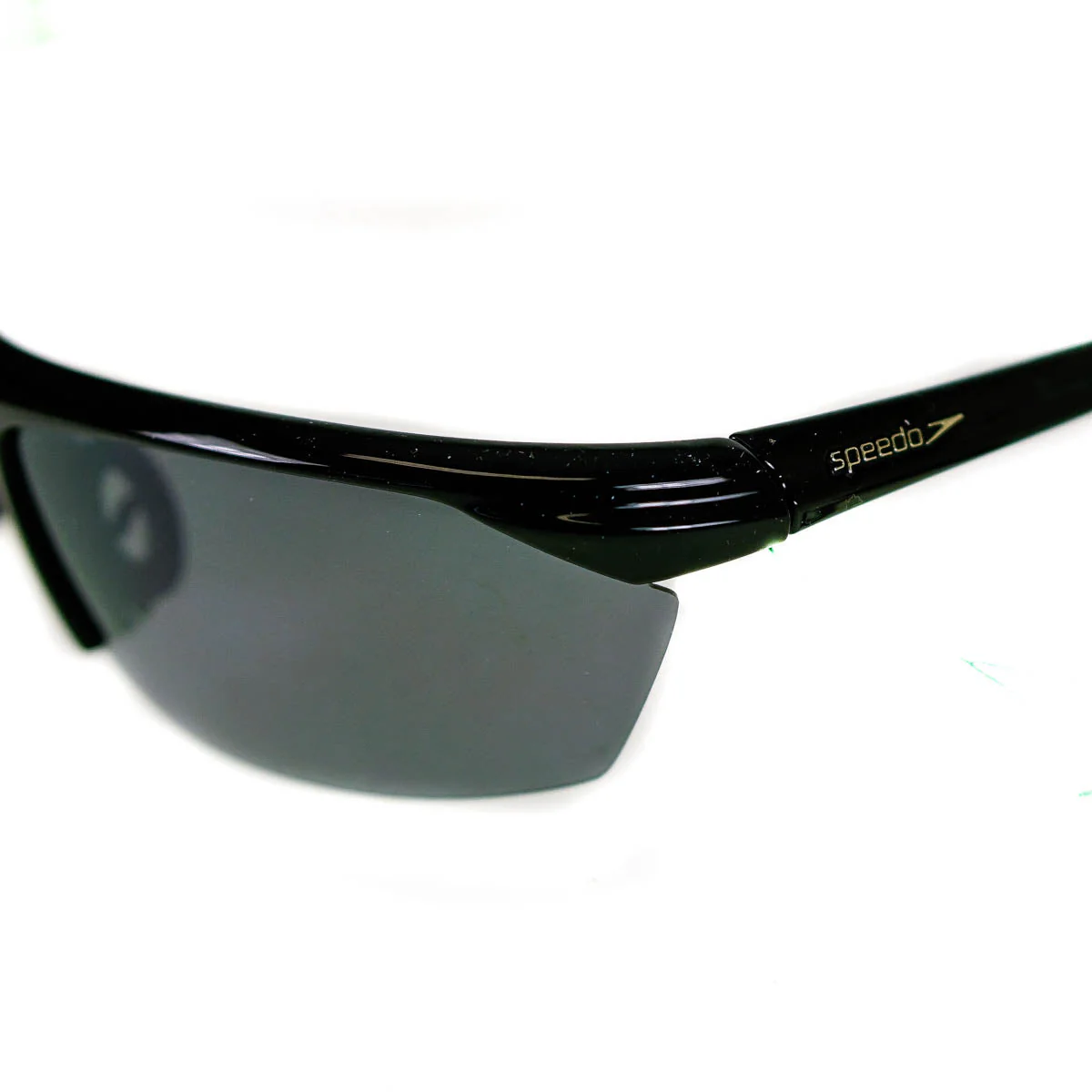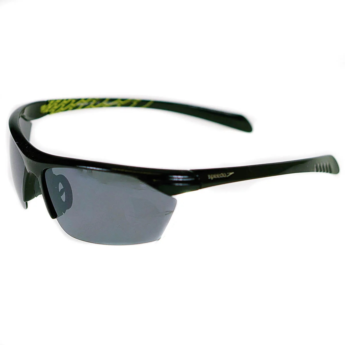 Gloss black, green graphic arms, Speedo logo on left arm Solid smoke silver flash mirror lens.