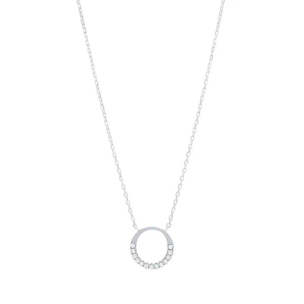 This fabulous Sterling Silver Open Circle with Cubic Zirconia features a half plain and half inlaid with cubic zirconia stones. This piece is set in stunning sterling silver.