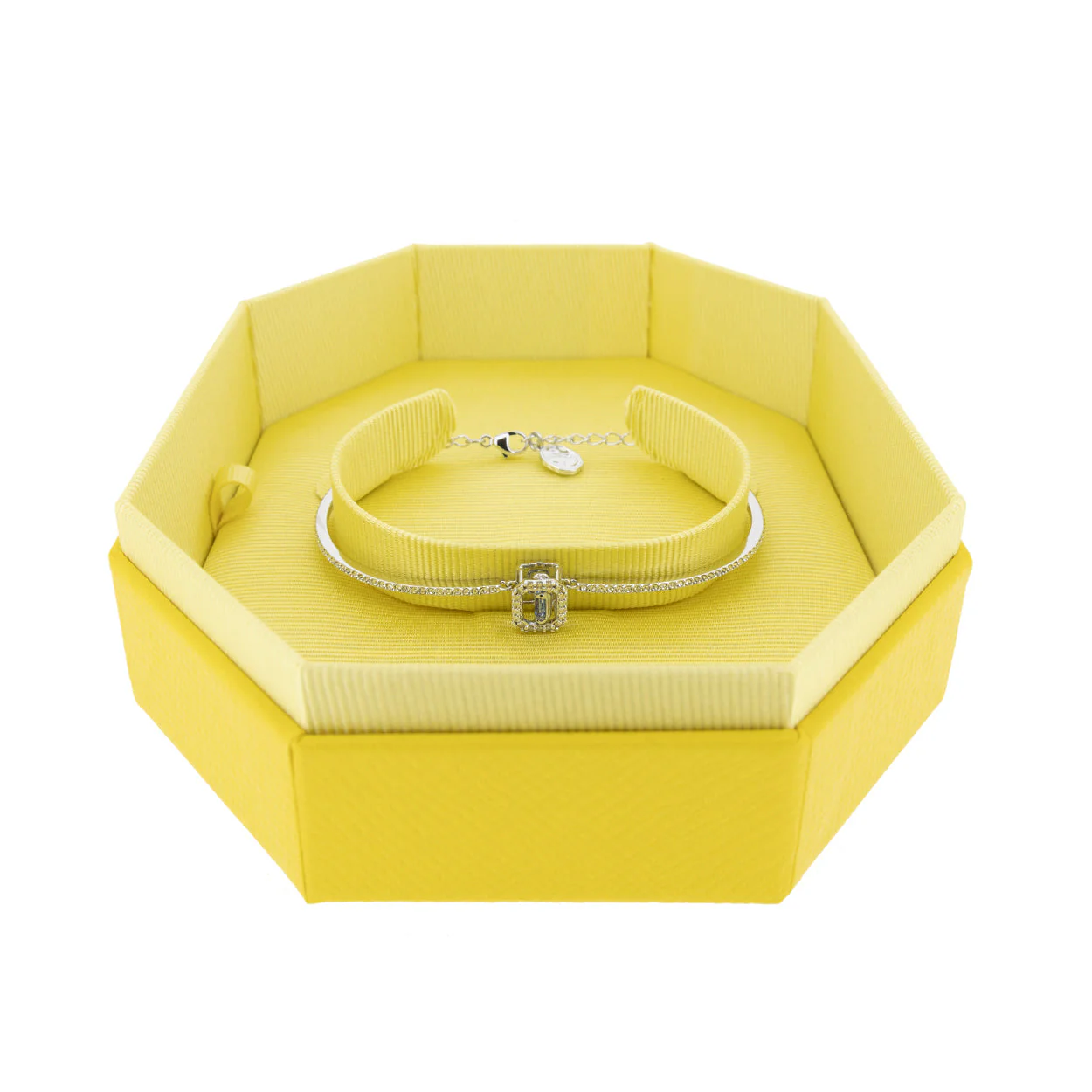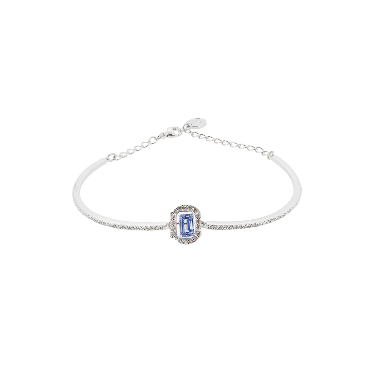 Elegance meets accessibility in this bangle.Featuring a stunning blue octagon-cut stone, encircled by delicate crystals with a chic rhodium-plated band with a secure lobster clasp.