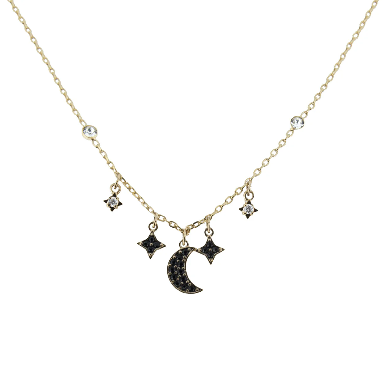Capture the stunning beauty of the moon and stars with this romantic rose gold-plated necklace. Its dark and light tones, adorned with crystals, offer an astronomically-inspired design that feels bohemian yet luxurious. Ideal for layering or pairing with the matching bracelet and ring, this necklace adds a touch of elegance to any collection.