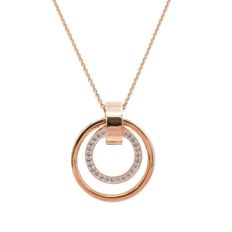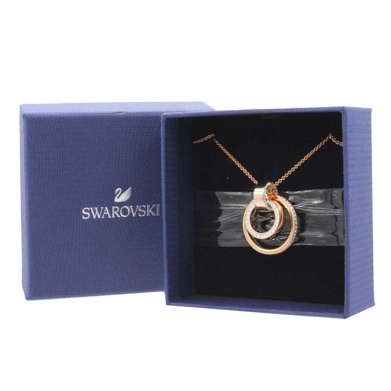 Plated in rose gold this necklace from Swarovski will add glamour and sparkle to any look! Featuring interlocking, contemporary hoop design sparkles with crystal pave.