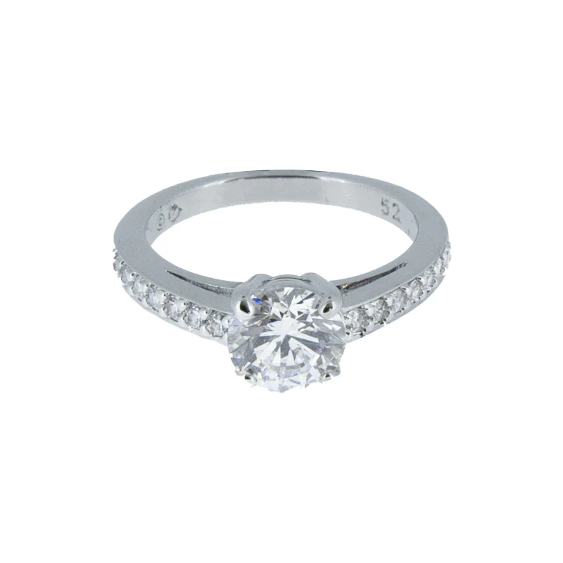 Gift romance with Swarovski’s Attract Round ring. This rhodium-plated stunner showcases a central round chaton flanked by sparkling chatons on either side, adorning the front half of the ring. Versatile for day or evening wear.