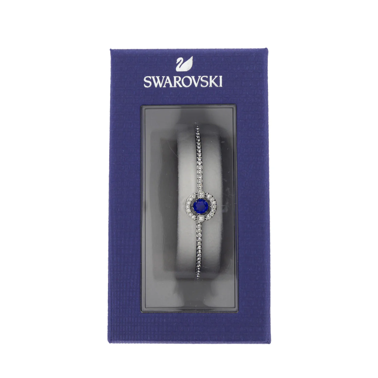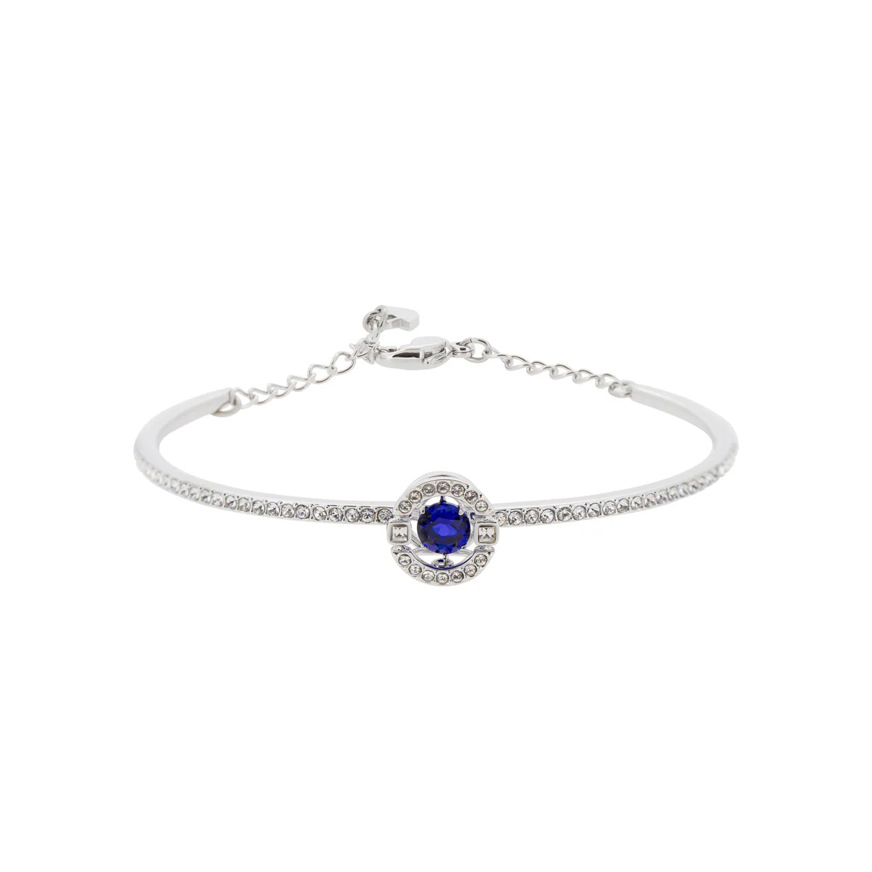 Adorn your wrist with the Swarovski Sparkling Dance Bracelet, a symphony of elegance and shimmer. This exquisitely crafted piece features a central sapphire-coloured crystal, encased in a dynamic setting that gives the illusion of floating. Surrounded by a halo of clear crystals, it rests delicately on a rhodium-plated band, intricately embellished with even more sparkling stones. With its adjustable chain closure, it ensures a perfect fit for any occasion.