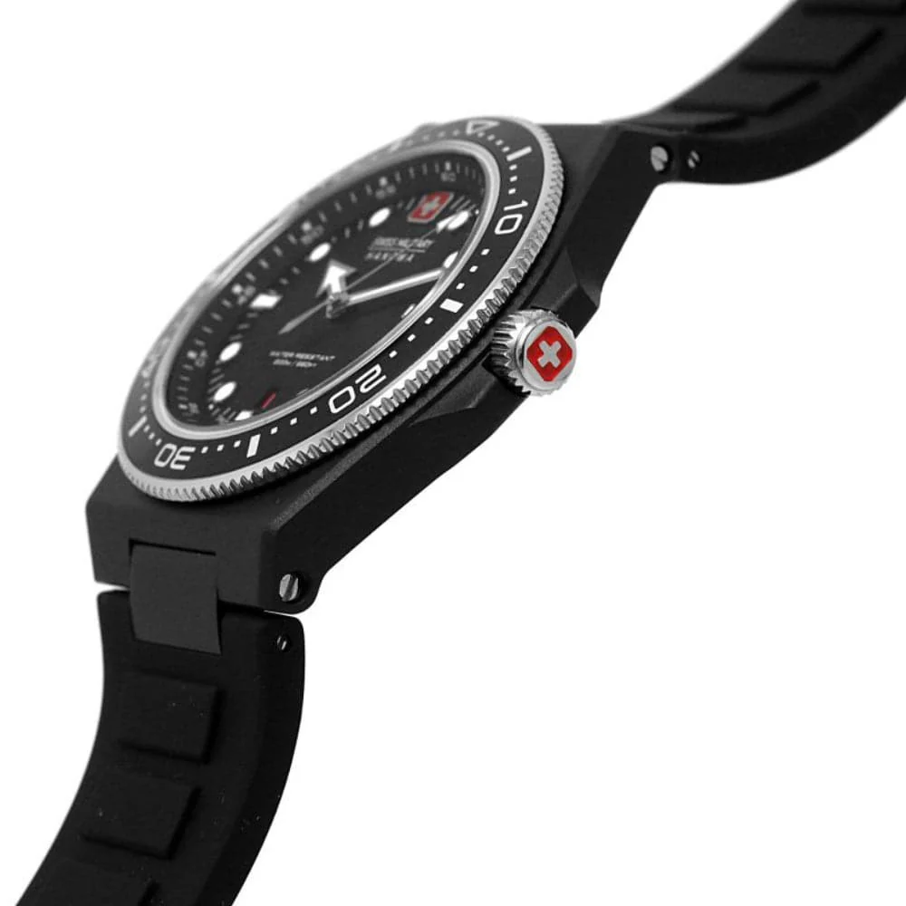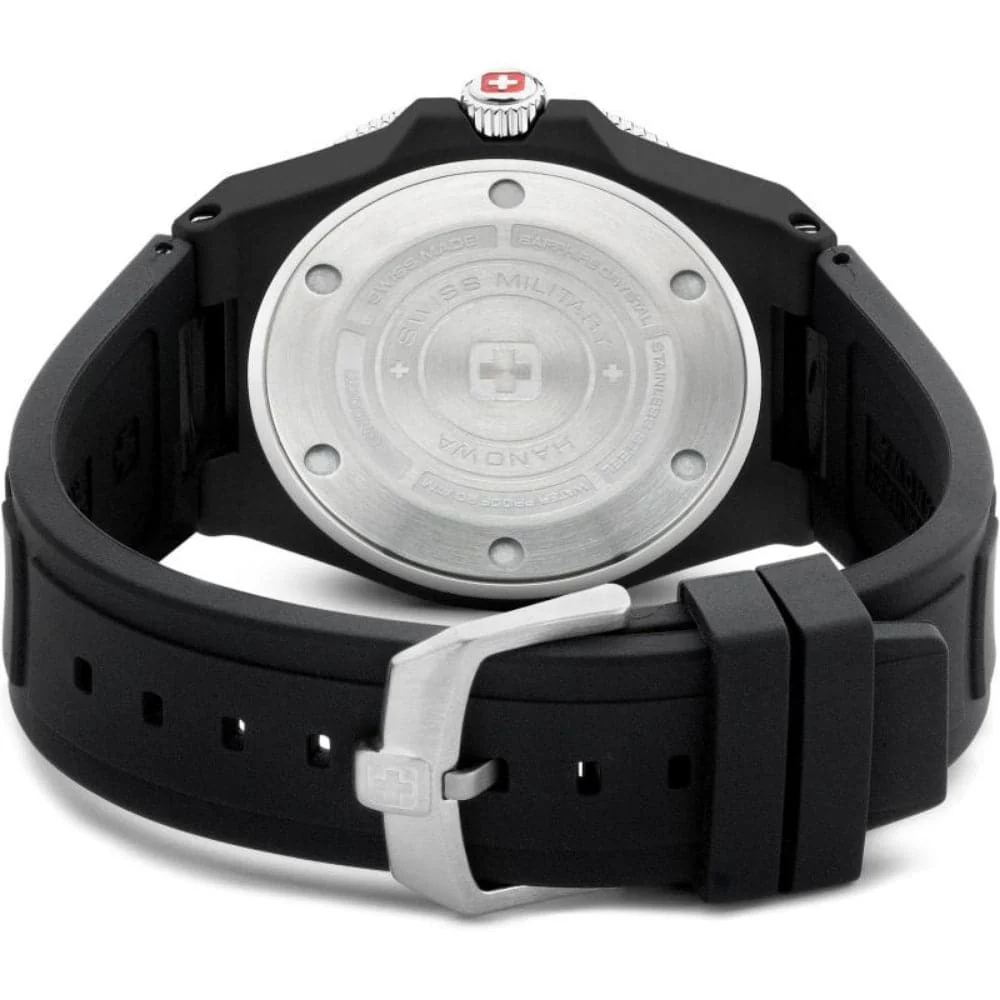 The Swiss Military Hanowa Ocean Pioneer #Tide SMWGN0001180 is a phenomenal Swiss Made watch with a quartz movement. The case is made from #tide ocean-bound plastic, which shows the brand’s commitment to operating in a more sustainable and ethical fashion. This material is lightweight and sturdy, which makes the watch even more comfortable, especially with the supple silicone strap. Another benefit is that this material is coloured entirely and not just coated. At 45mm (excluding crown) and 11mm thickness this watch has substantial wrist presence which goes very well with the casual style of the watch.