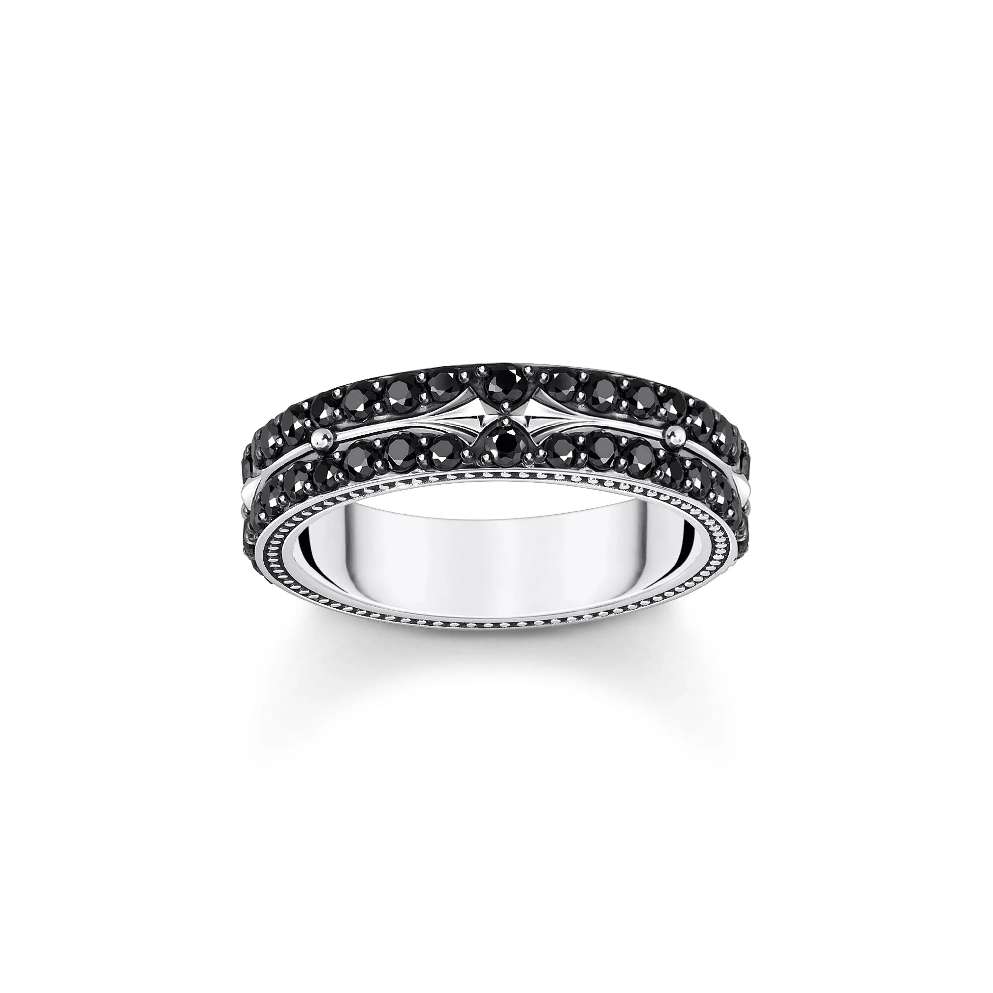 Experience striking contrasts and sophisticated design with the THOMAS SABO decorated band ring, crafted from recycled, blackened silver. This unisex piece features gently contoured 3D facets and a full circle of sparkling black zirconia stones, creating an arresting interplay of light and shadow. Signature engravings along the band reflect the brand’s celebrated attention to detail, while the blend of modern style and subtle rebellious elegance makes this ring a distinctive statement for men and women alike. Perfect for adding a touch of intrigue and glamour to any occasion, this piece is a true testament to the innovation and artistry behind Thomas Sabo jewelry.