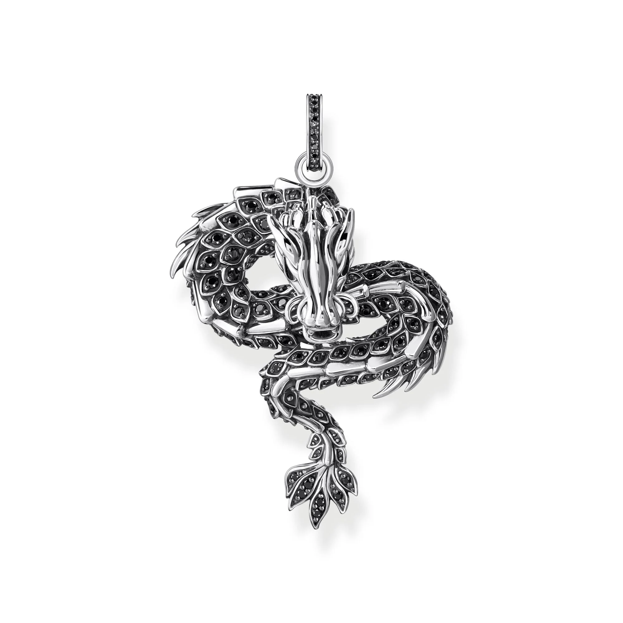 The THOMAS SABO Dragon pendant showcases impeccable artistry with 82 hand-set black zirconia stones, each sparkling within its intricate scale pattern. Crafted from recycled silver featuring a distinctive blackened finish, this striking piece radiates strength and elegance. Eyes hand-painted with black cold enamel add dramatic detail, creating a truly captivating look. With its bold, modern design and premium materials, this pendant by Thomas Sabo is a timeless statement of courage and sophistication, perfect for elevating both men’s and women’s jewelry collections.