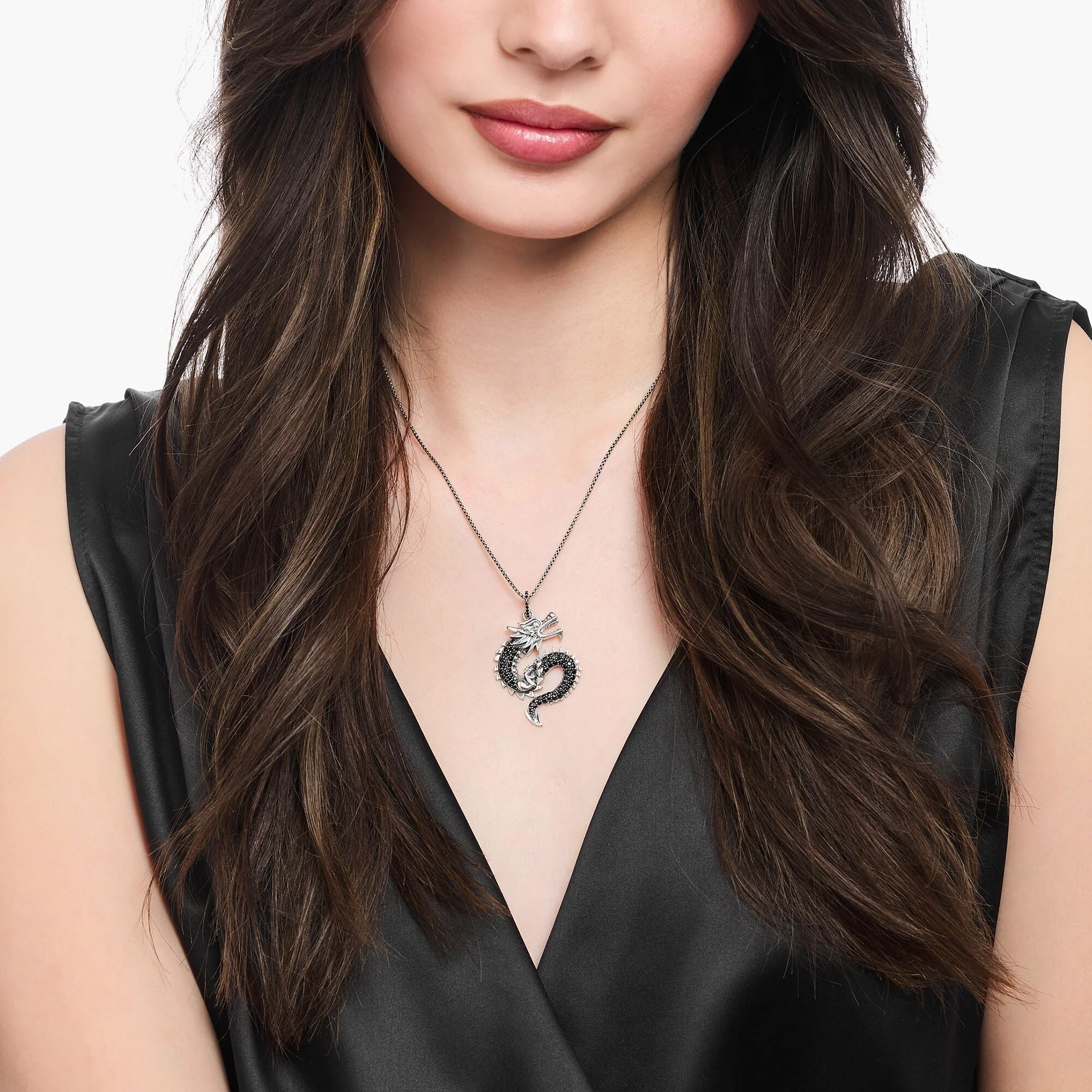 Embrace modern elegance with the THOMAS SABO dragon pendant, crafted from recycled silver and finished with a signature blackened look. Sparkling black zirconia stones highlight the artfully curved dragon, whose fine scale patterns and striking head capture the strength and allure of this mythical creature. This refined unisex jewelry piece embodies the dynamic spirit of the Thomas Sabo brand, seamlessly blending glamour with expressive design for a bold yet sophisticated touch to any ensemble.