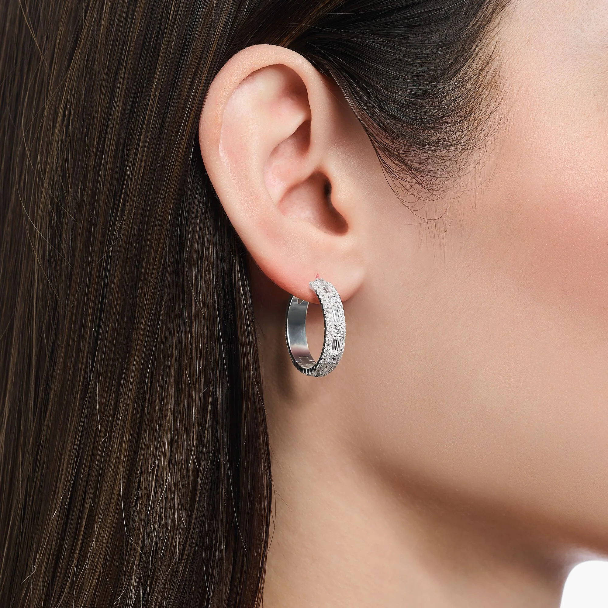 Thomas Sabo hoop earrings bring effortless elegance with a sophisticated pavé of white stones and raised octagon-cut accents that capture and reflect the light. Crafted from recycled silver, each creole showcases a beautifully understated design, elevated by a subtle imitation stone structure on the reverse and a secure clip fastening. These unisex earrings offer modern glamour and refined style, embodying Thomas Sabo’s renowned craftsmanship and signature expressive artistry for those who seek premium, versatile jewelry in every occasion.