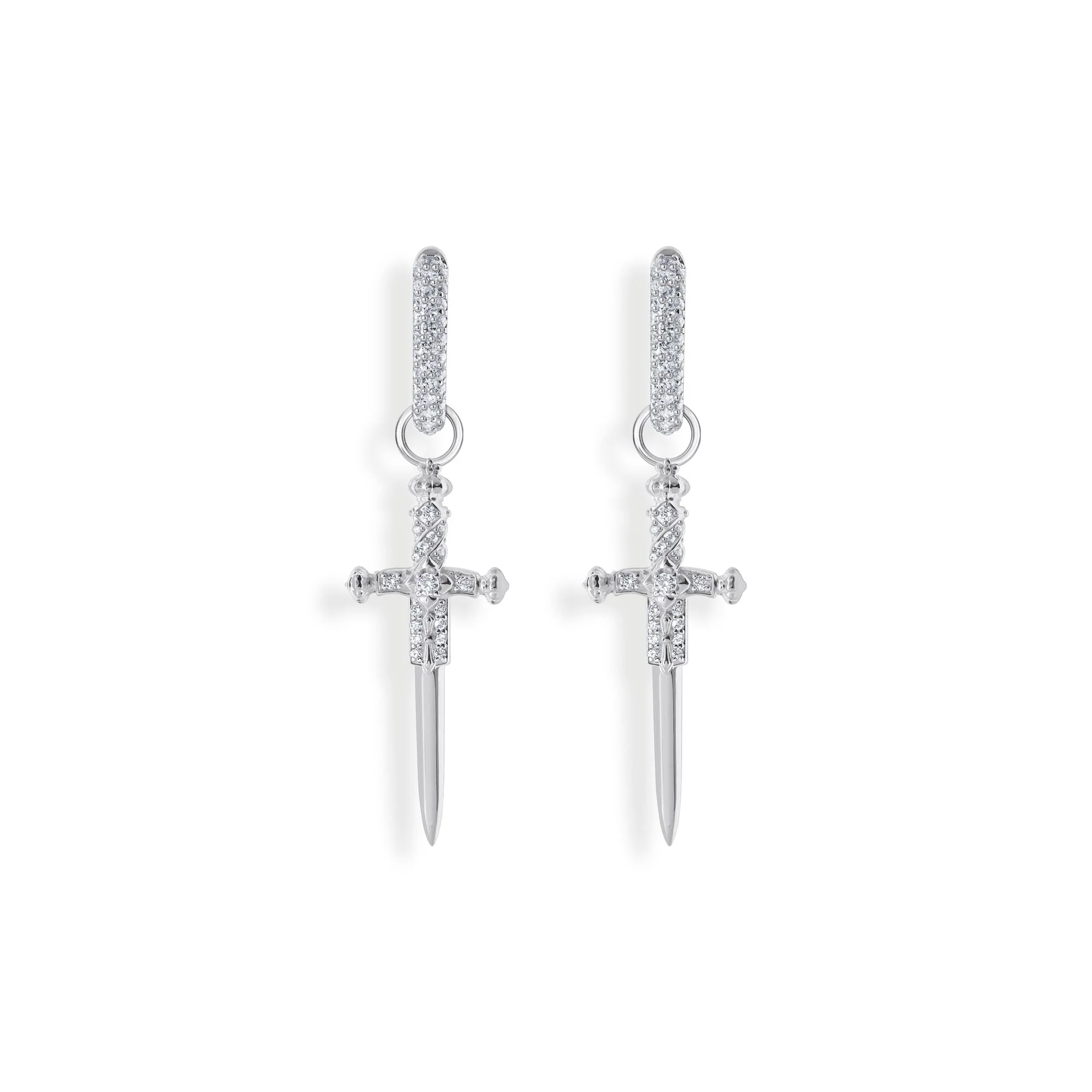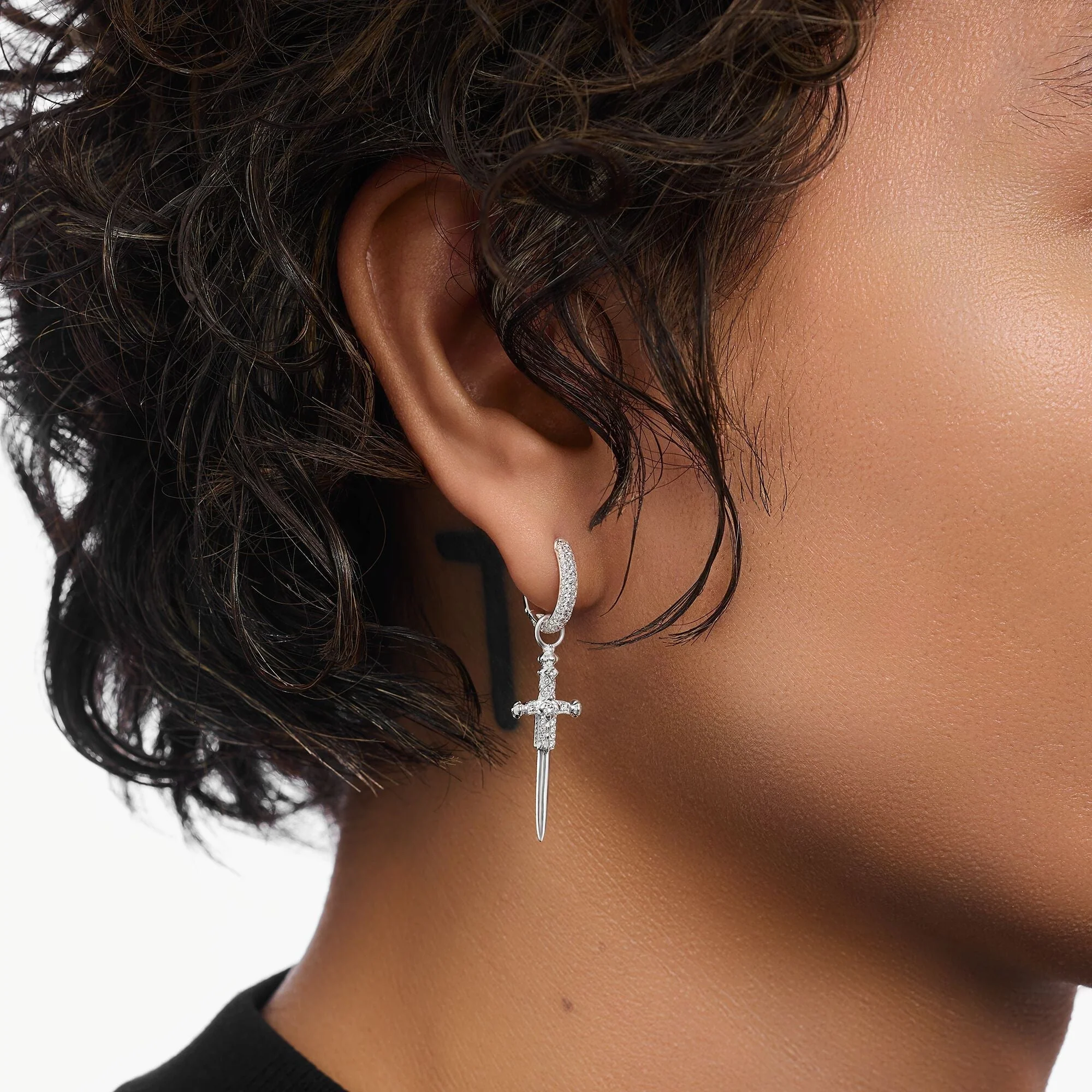 Experience the refined edge of Thomas Sabo with this single hoop earring, crafted from recycled blackened silver and adorned with brilliant white zirconia stones. The detachable sword pendant adds versatility, allowing for two unique looks in one elegant piece. Carefully set pavé stones shimmer on the front of the hoop, enhancing its modern yet glamorous style. Perfect for those who appreciate expressive design and exquisite craftsmanship, this unisex earring exudes sophisticated charm and rebellious glamour for any occasion.