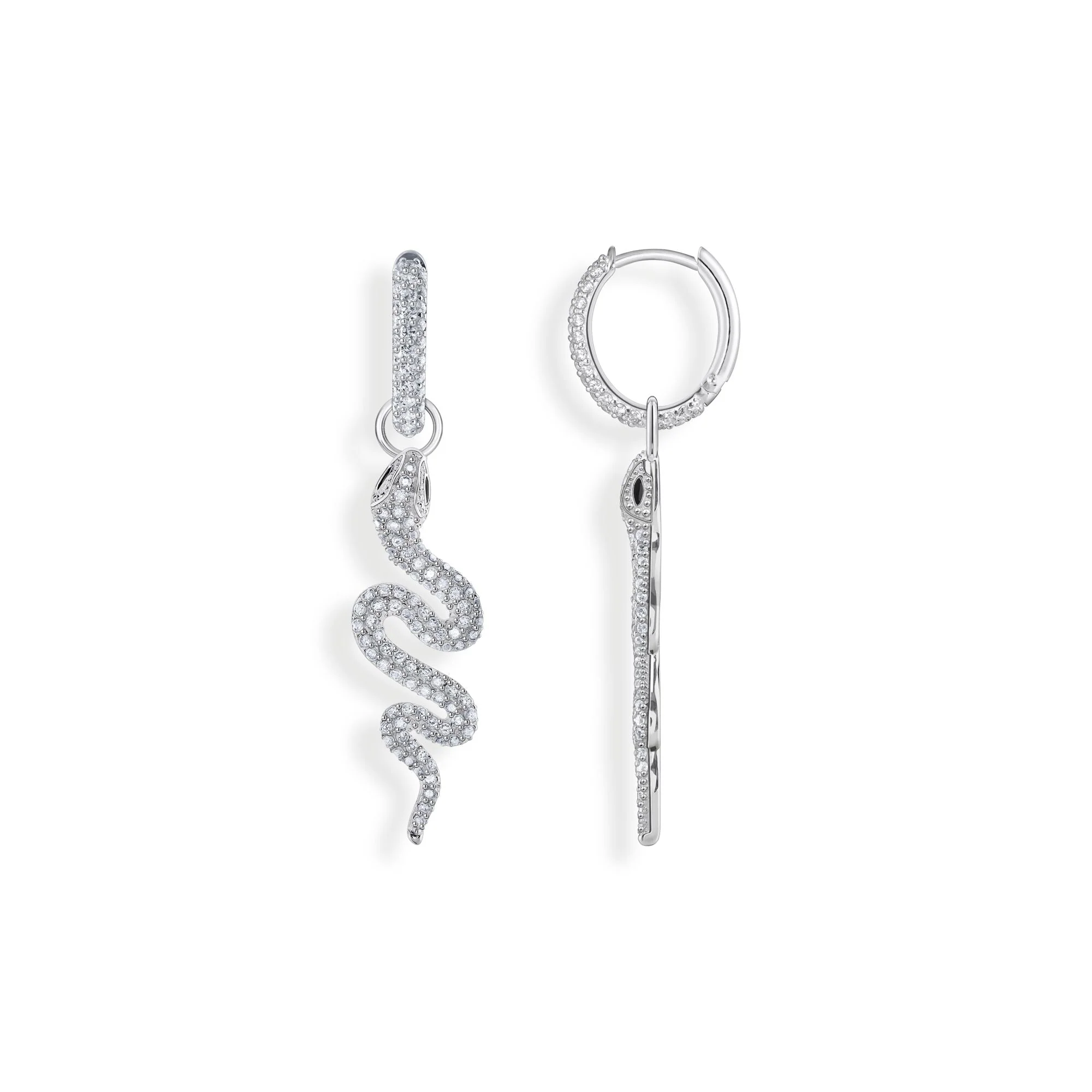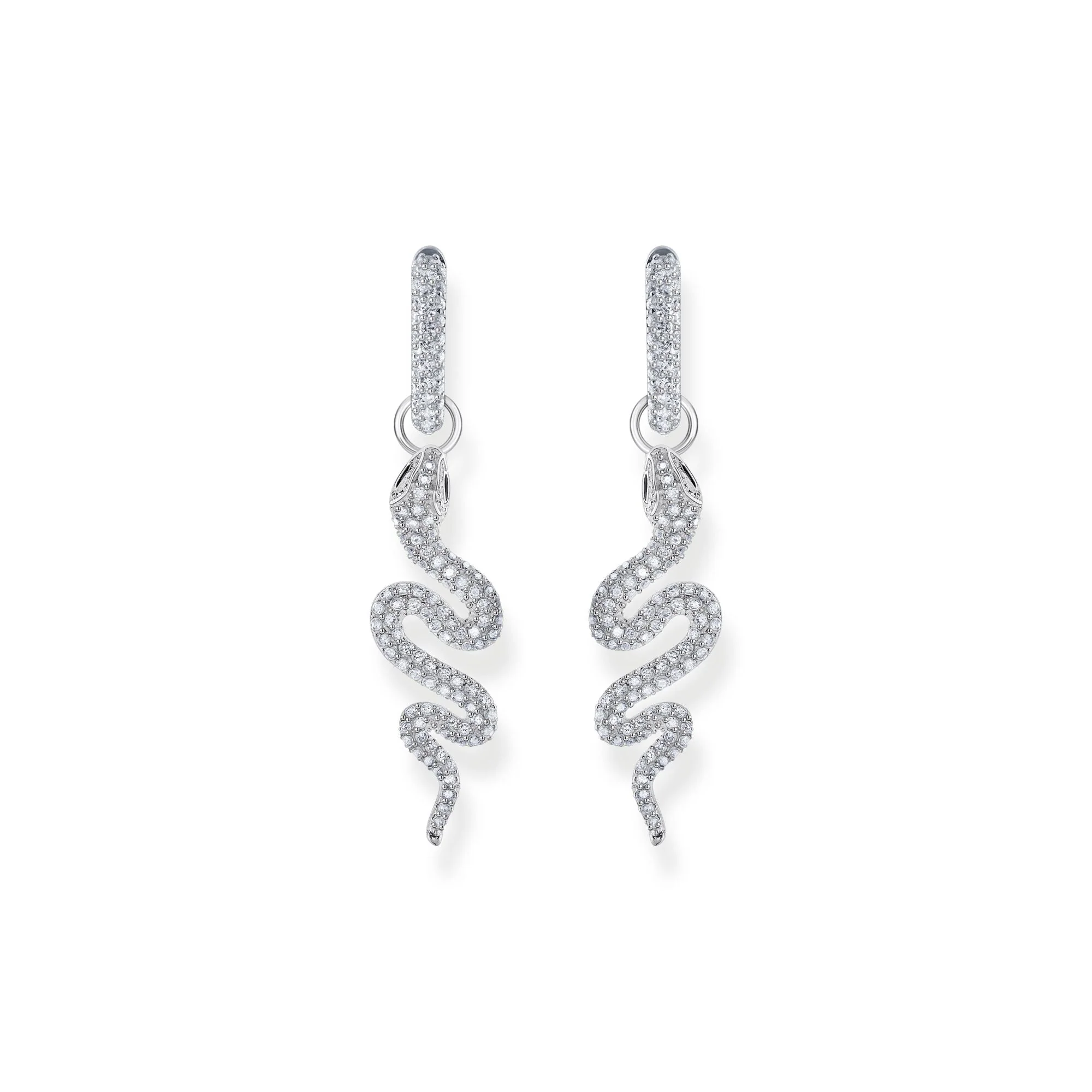 The THOMAS SABO single hoop earring with white stones captivates with its modern design and fine craftsmanship. Crafted from recycled silver, this unisex earring features an elegant hoop adorned with a pavé of glistening white zirconia, complemented by a detachable snake pendant whose eyes are delicately hand-painted with black cold enamel. Effortlessly stylish with a refined creole clip fastening, this piece expresses a balance of glamour and versatility, reflecting the iconic, trendsetting allure that distinguishes Thomas Sabo jewelry worldwide.