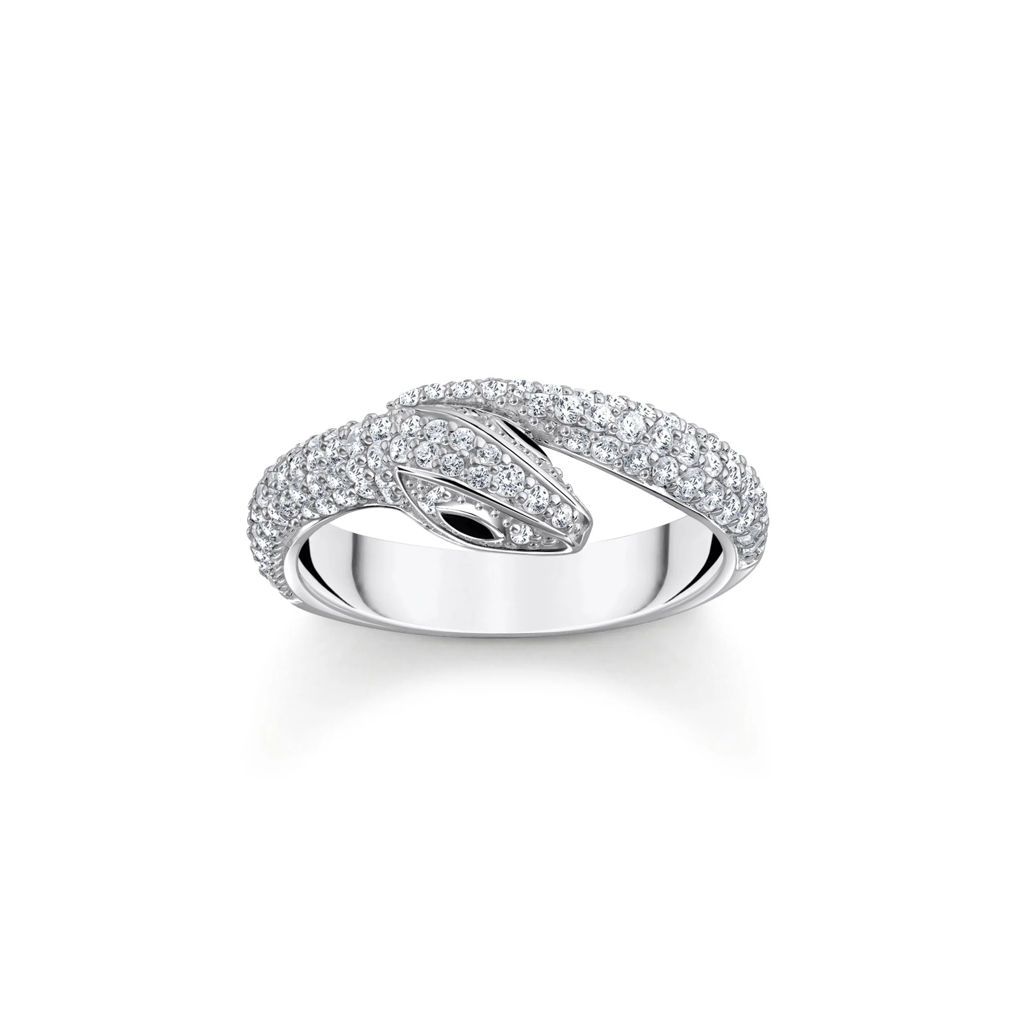 Experience the allure of the Thomas Sabo Snake ring with dazzling white zirconia pavé, featuring captivating hand-painted black enamel eyes that enhance its striking silhouette. Crafted in recycled silver, this unisex ring is a modern statement that reflects the brand’s dedication to artistry and sustainable luxury. The iconic THOMAS SABO lettering graces the underside, affirming timeless style and unmistakable craftsmanship. Perfect for those who appreciate unique jewelry, this ring merges rebellious design with refined elegance for effortless day-to-night appeal.