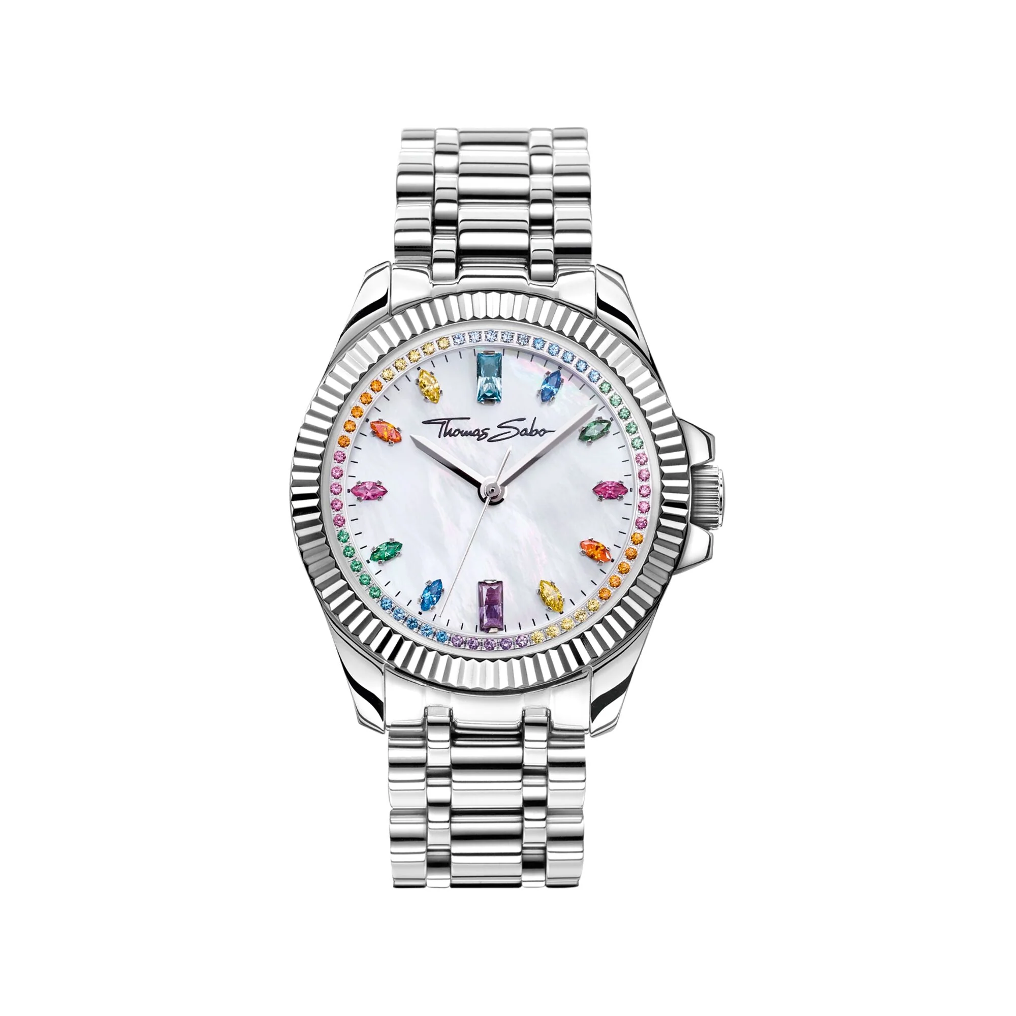 This THOMAS SABO women’s watch from the Divine Rainbow collection embodies modern elegance with its silver-coloured stainless steel case, vibrant glass-ceramic stones, amethyst, synthetic aquamarine, and glistening zirconia. A folding clasp ensures secure sophistication, while the mineral glass coated with sapphire offers lasting clarity. Each detail, from the luminous stones to the sleek profile, reflects the brand’s renowned craftsmanship and commitment to timeless style, making this women’s watch a radiant accessory for any occasion.