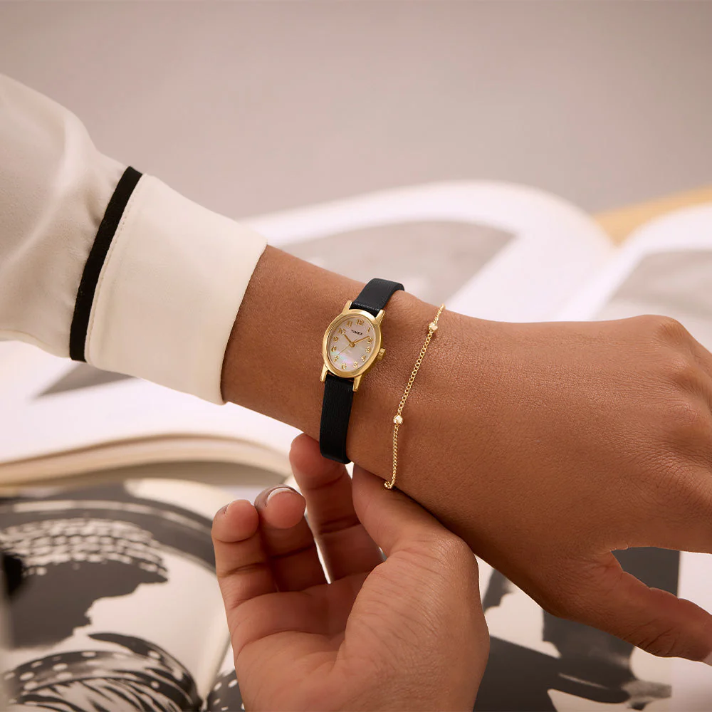 The Timex Cavatina women’s watch gracefully combines a polished 18mm gold-tone oval case with a luminous mother-of-pearl dial, exuding subtle sophistication. Its slender black leather band and refined silhouette evoke timeless elegance, while the mineral crystal glass and brass construction speak to superior craftsmanship. Powered by precise quartz movement and offering water resistance up to 30 meters, this piece from the women’s watch category blends heritage and contemporary design for an accessory that transitions seamlessly from day to night.