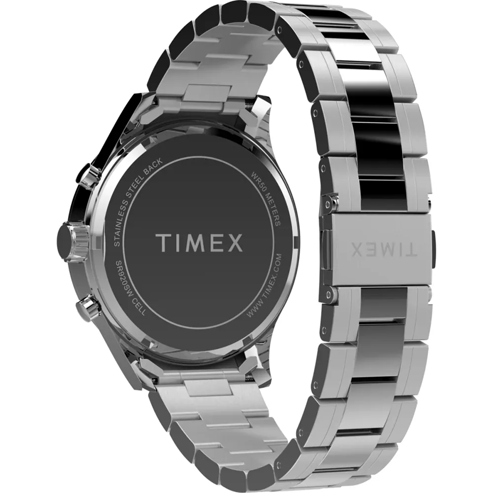 Timex Chrono TW2Y01400 men’s watch features a striking black dial within a 43mm stainless steel case, designed for both contemporary elegance and lasting durability. Its quartz chronograph movement ensures precise timekeeping and includes stopwatch functionality, all protected beneath a clear mineral crystal. The polished stainless steel band enhances its refined presence, ideal for professional and casual occasions. With 5 ATM water resistance and meticulous craftsmanship, this premium watch from Timex blends timeless style and reliable performance, making it a standout accessory for those who value sophistication and resilience.