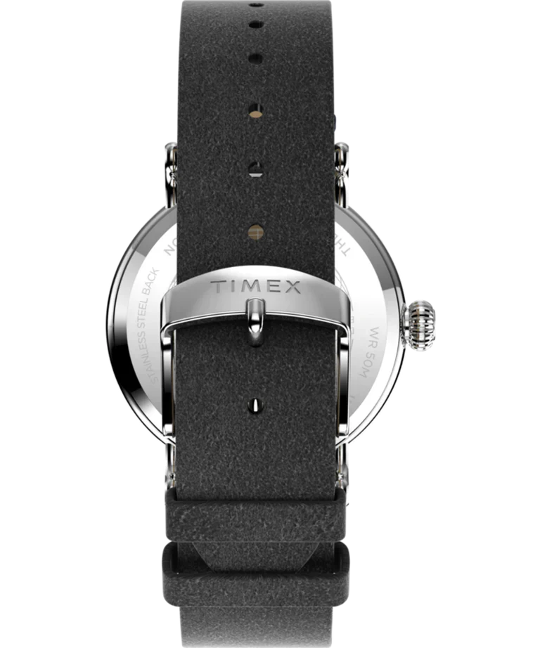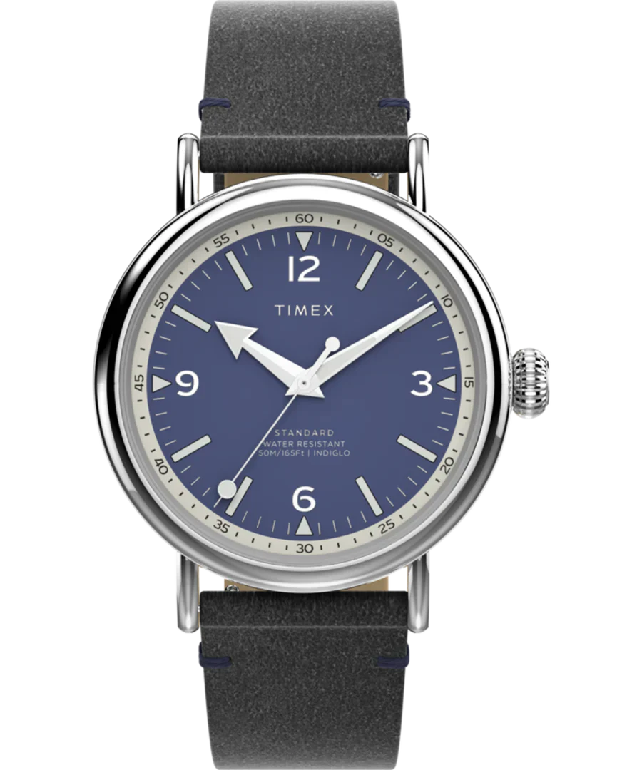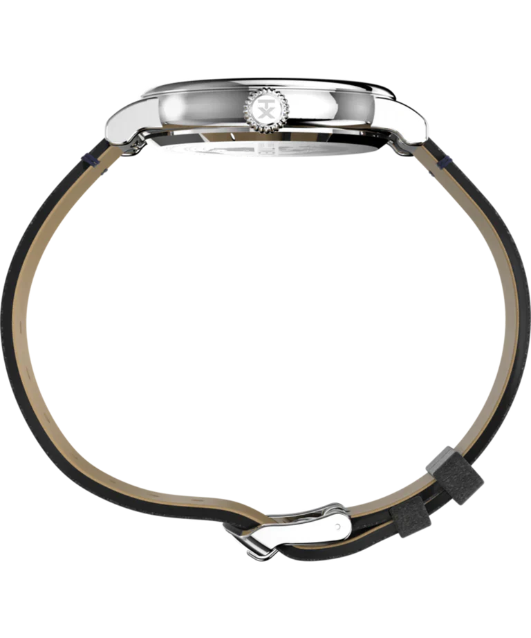 This Timex men’s watch pairs a refined navy-blue dial with a polished silver-tone 40mm case, offering timeless elegance for everyday wear. The eco-friendly black Ecco DriTan™ leather strap delivers comfort, sophistication, and responsible craftsmanship, while quick-release spring bars lend versatility. A mineral crystal glass provides durability, complemented by a reliable quartz movement and water resistance to 50 meters. Subtle details and a streamlined design make this piece a standout addition to any jewelry collection, perfectly balancing classic style and modern sensibility.
