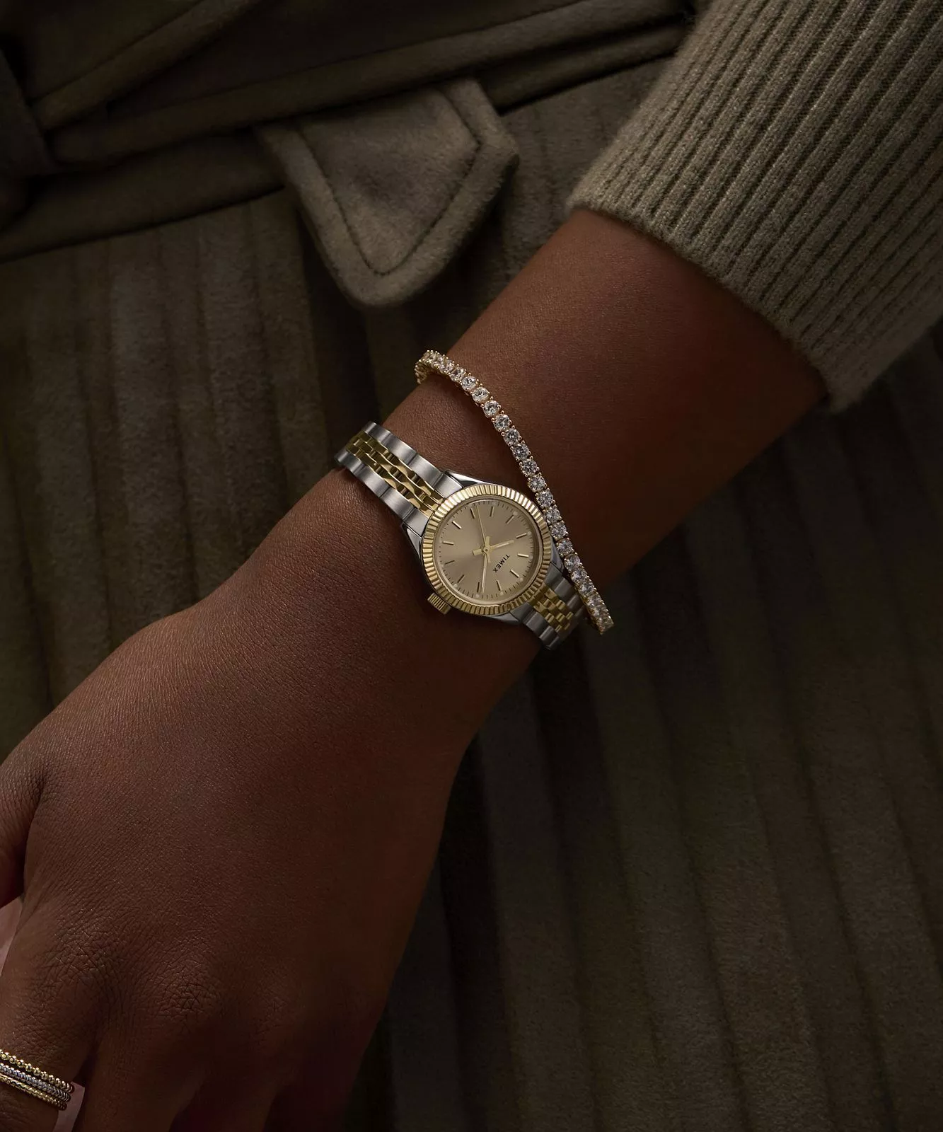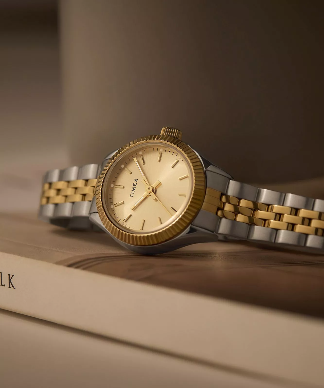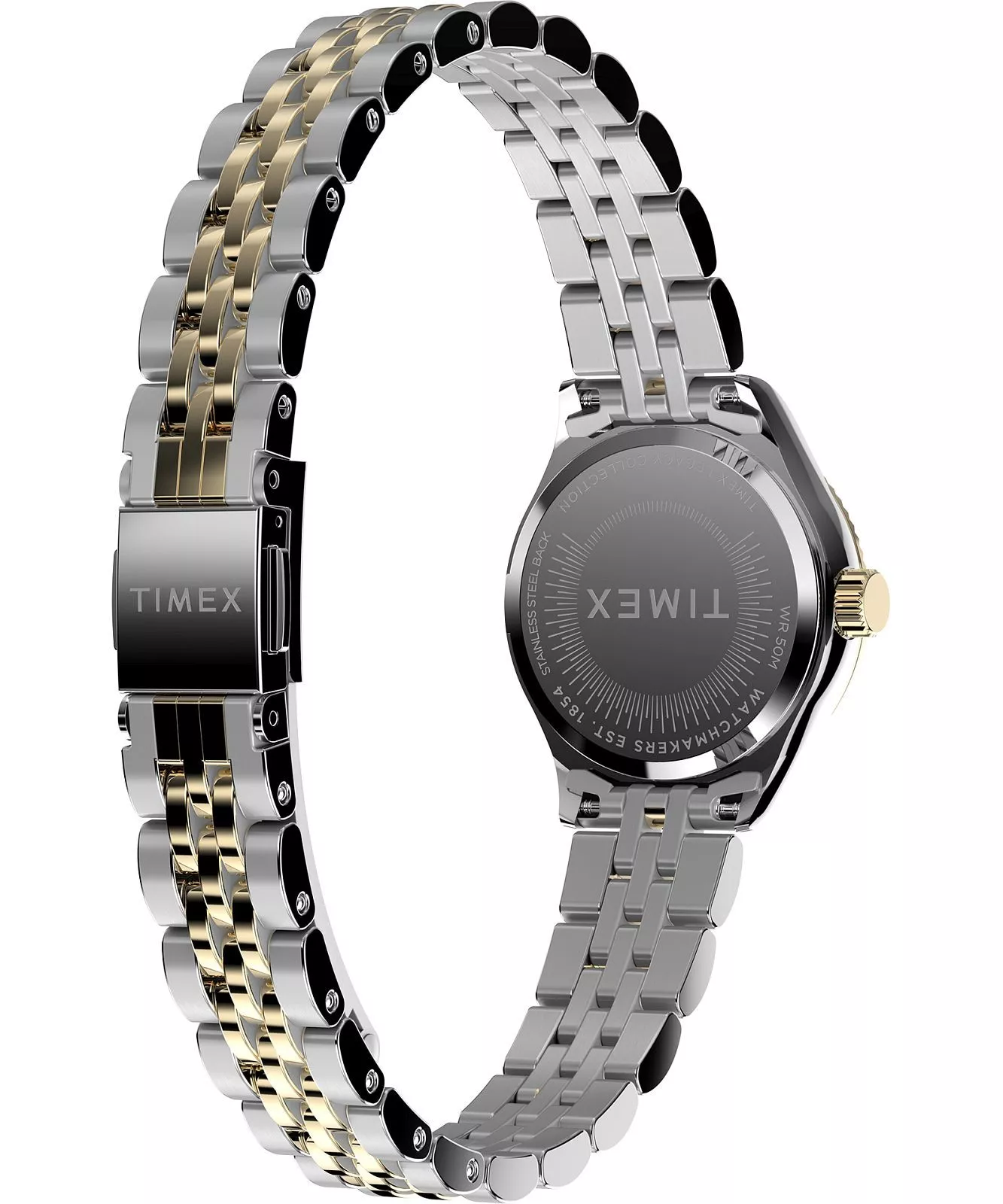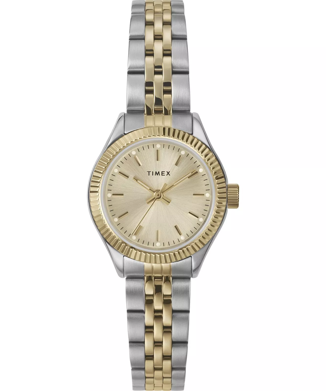 This women’s watch from Timex showcases a refined two-tone stainless steel bracelet, blending brushed and polished finishes for a touch of modern sophistication. Its petite 25mm case in low lead brass frames a radiant gold sunray dial with full markers, elegantly accented by a finely fluted bezel. Crafted with a mineral crystal lens and powered by quartz movement, the design offers reliable performance and water resistance up to 50 meters. A deployant clasp enhances comfort and security, making this piece an exceptional accessory in the Timex tradition of enduring style and craftsmanship, perfect for those who appreciate jewelry with timeless appeal.