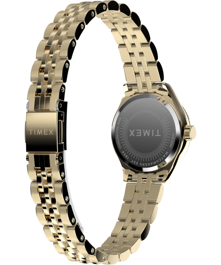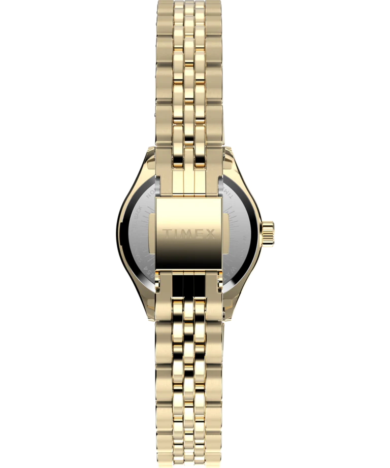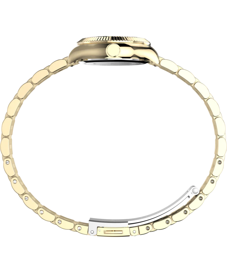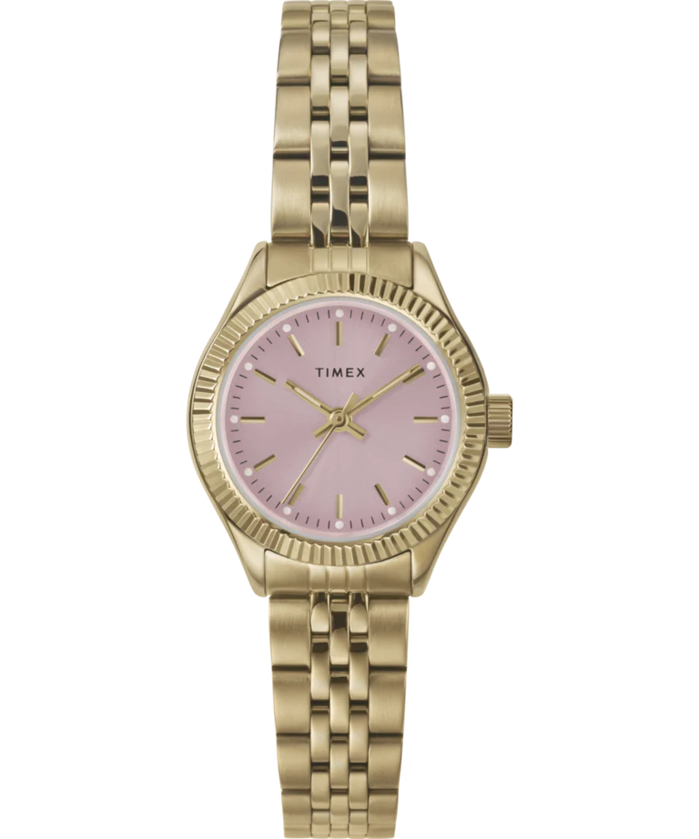 This women’s watch from Timex radiates refined charm, pairing a petite 25mm gold-tone case with a delicate sunray pink dial and luminous full markers. An elegantly fluted bezel frames the face, while the brushed and polished stainless steel bracelet offers enduring shine and graceful comfort. With reliable quartz analog movement, scratch-resistant mineral glass, and water resistance to 50 meters, this jewelry-inspired timepiece delivers both everyday sophistication and trusted durability in a truly timeless silhouette.