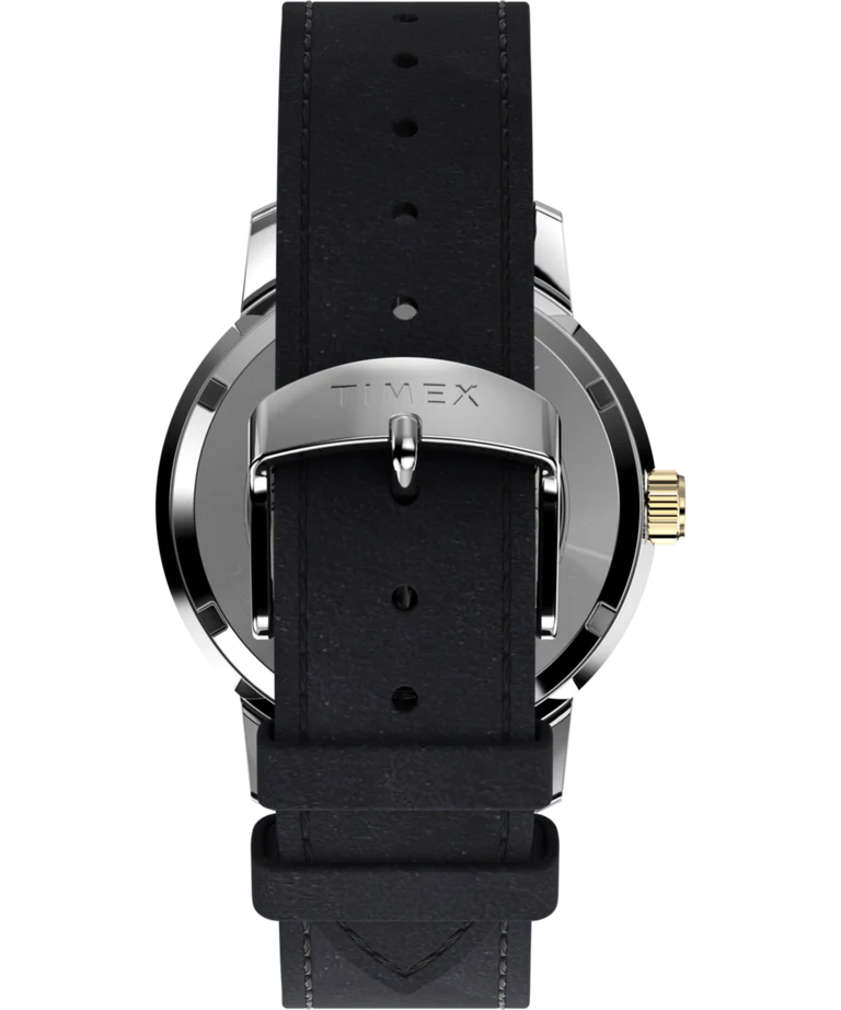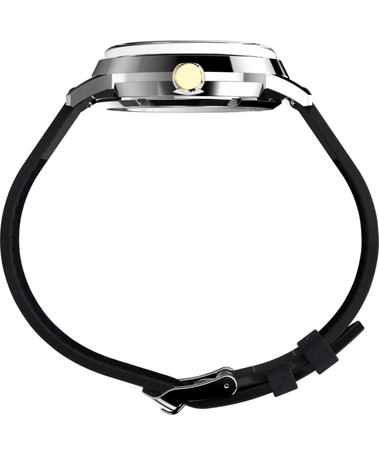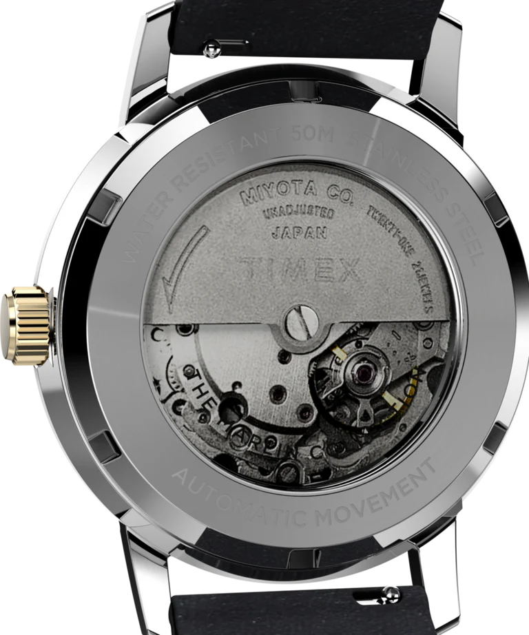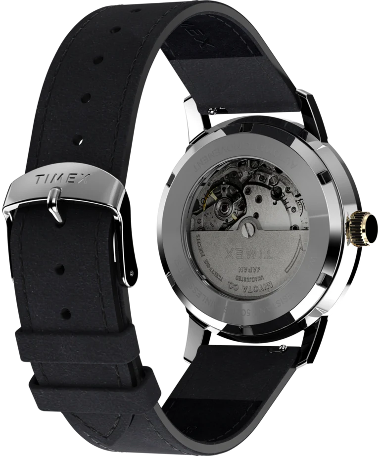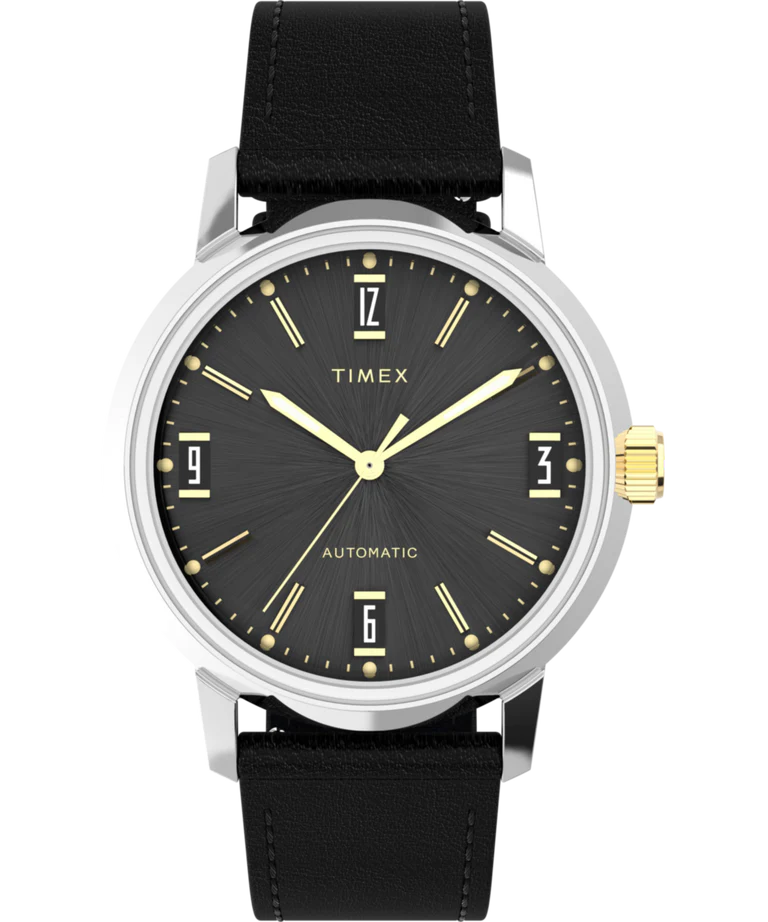 The Timex Marlin Automatic 40mm Leather Strap Watch captures the essence of timeless sophistication, blending a polished stainless-steel case with a deep black dial marked by subtle retro indices. Featuring a domed acrylic crystal and automatic mechanical movement, this men’s watch seamlessly merges classic aesthetics with modern reliability. The black leather strap, expertly crafted and LWG-certified, ensures lasting comfort and an elegant finish. With a transparent exhibition case back, 50-meter water resistance, and quick-release spring bars, this watch is designed for those who appreciate heritage craftsmanship in the world of luxury watches.