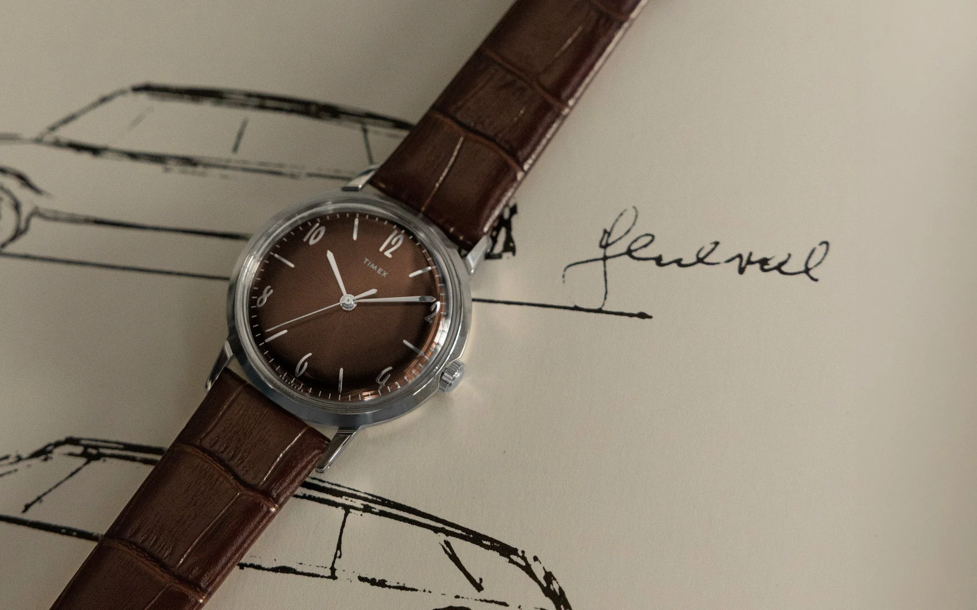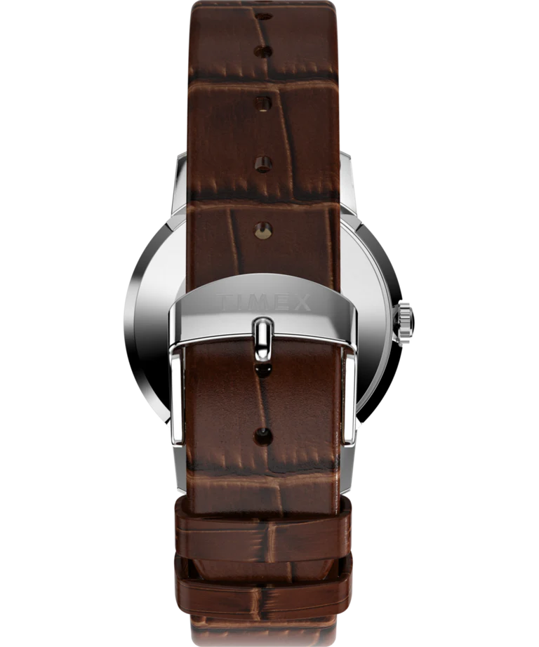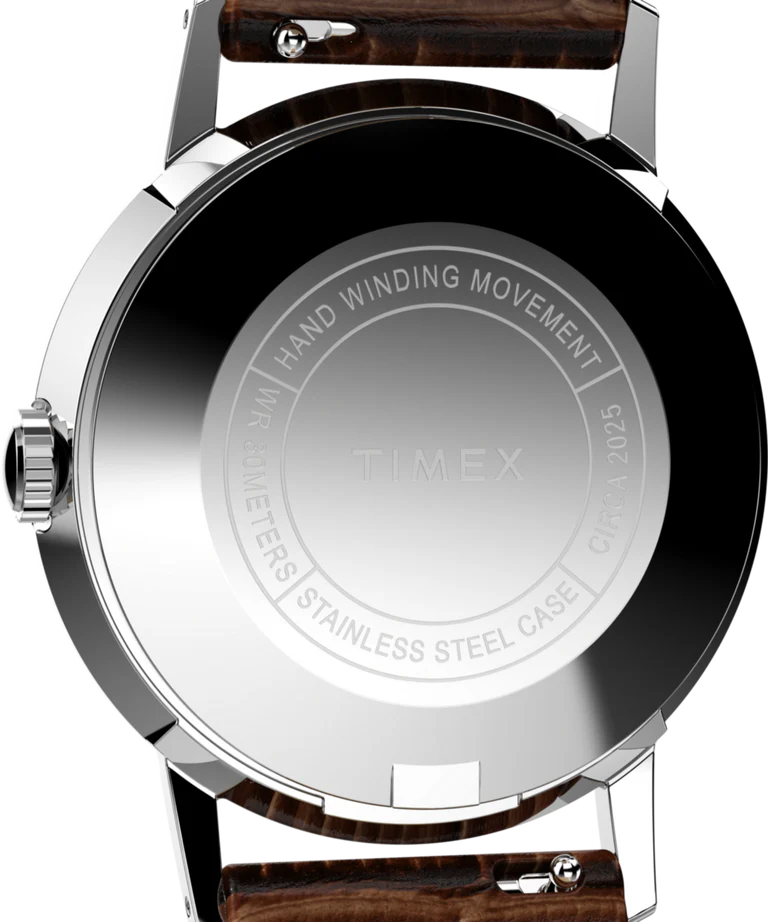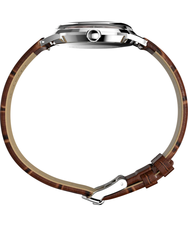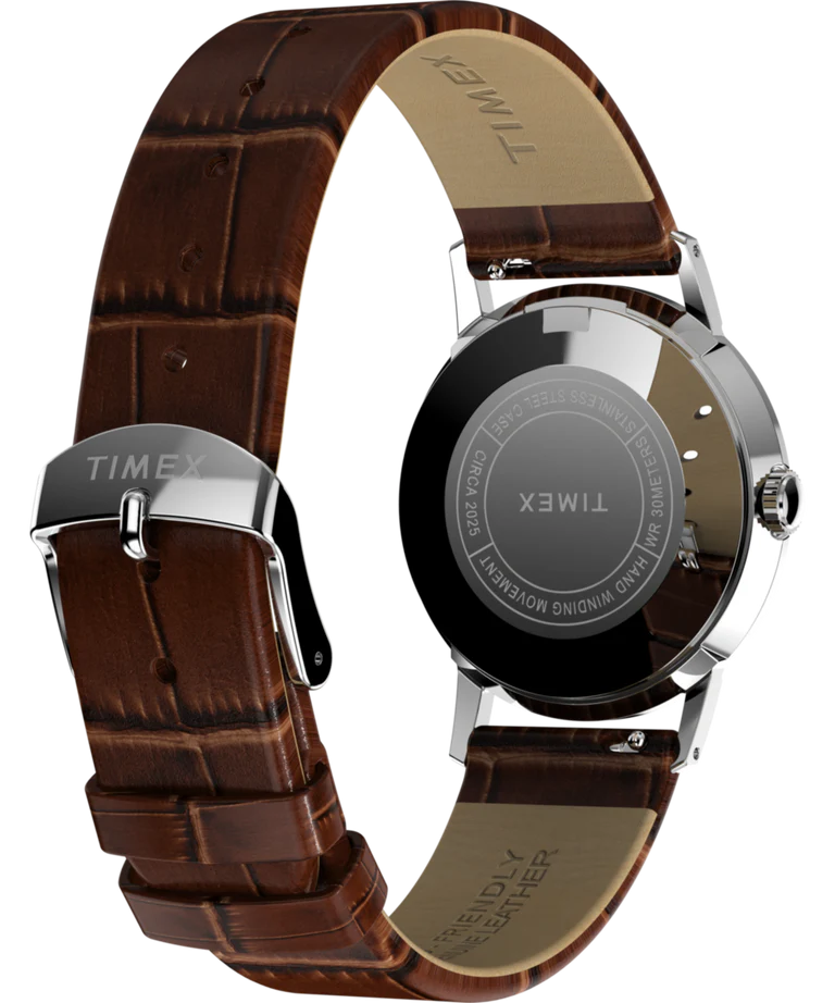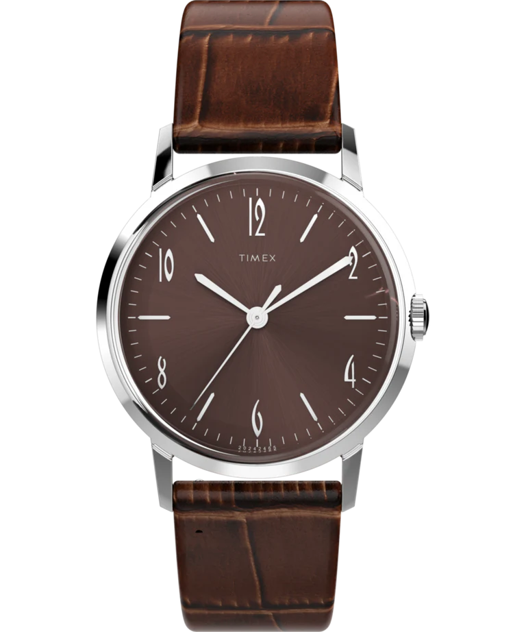 This Timex Marlin men’s watch captures timeless elegance with its polished 34mm stainless-steel case and a rich chocolate brown dial, highlighted by classic Arabic numerals. The hand-wound mechanical movement and domed acrylic crystal evoke vintage sophistication, while the eco-friendly leather strap with crocodile grain delivers comfort and refined detail. Water resistant to 30 meters, this watch is an exclusive statement piece, beautifully presented in a signature Timex box and perfectly suited for those who value heritage craftsmanship and understated style in luxury watches.