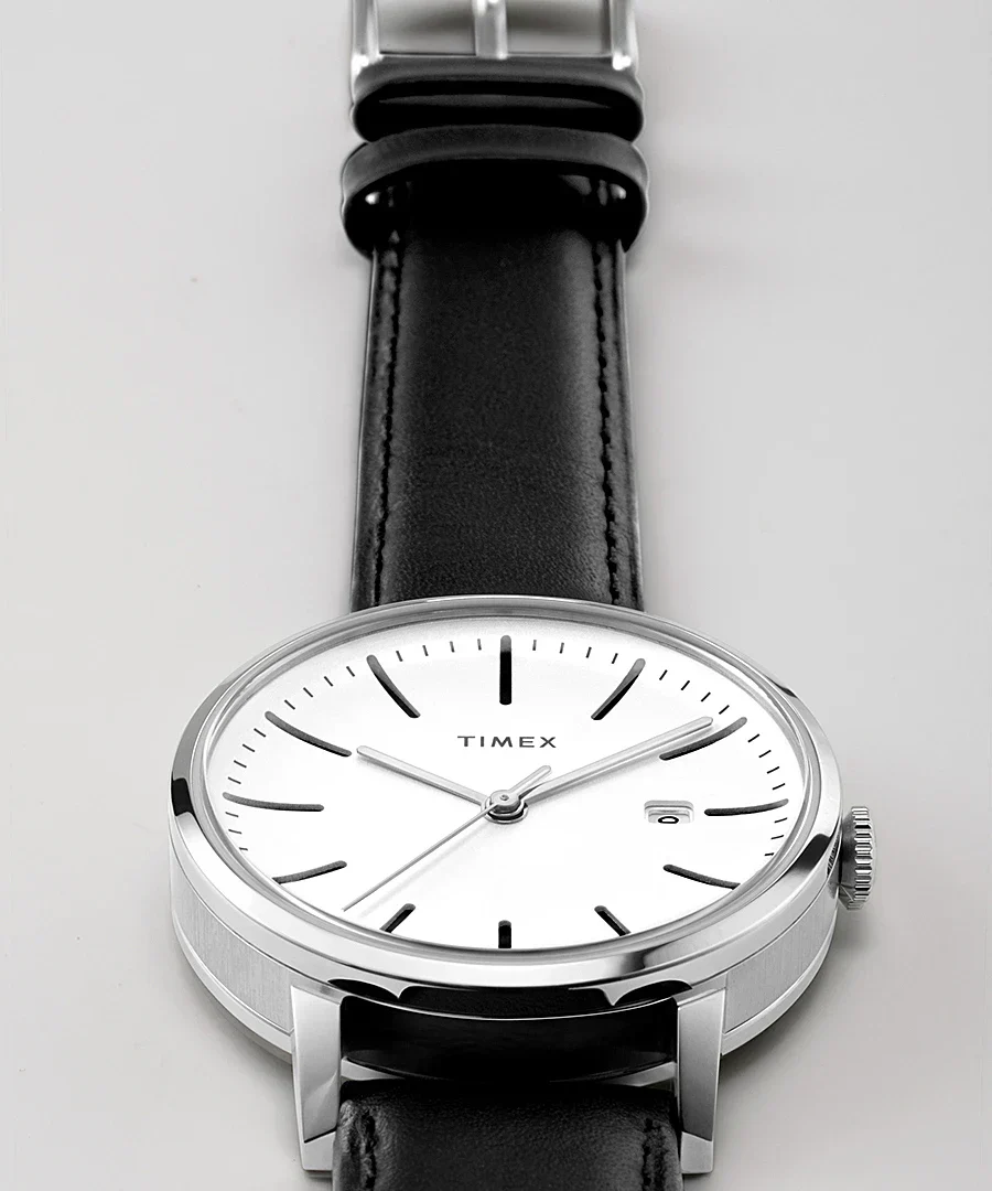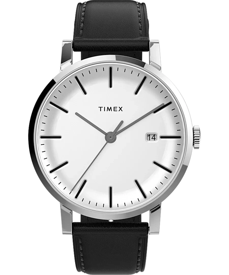 Refined and architectural in design, the Timex Midtown 38mm Stainless Steel Bracelet Watch TW2V36300 blends modern minimalism with timeless elegance. Crafted with a brushed and polished stainless-steel case and a crisp white dial, it captures attention with clean lines and full markers for effortless readability. This women’s watch features a sleek black leather band with a classic buckle and quick-release spring bars for added comfort and versatility, perfect for everyday sophistication. A mineral crystal lens protects the dial while a discreet date window enhances practicality. With water resistance up to 50 meters and precise quartz movement, this piece brings reliable performance to the forefront of city-ready style. A standout in the watches category, it’s designed for those who appreciate subtle luxury and enduring craftsmanship.