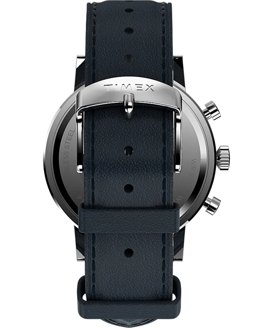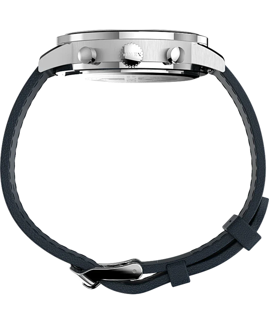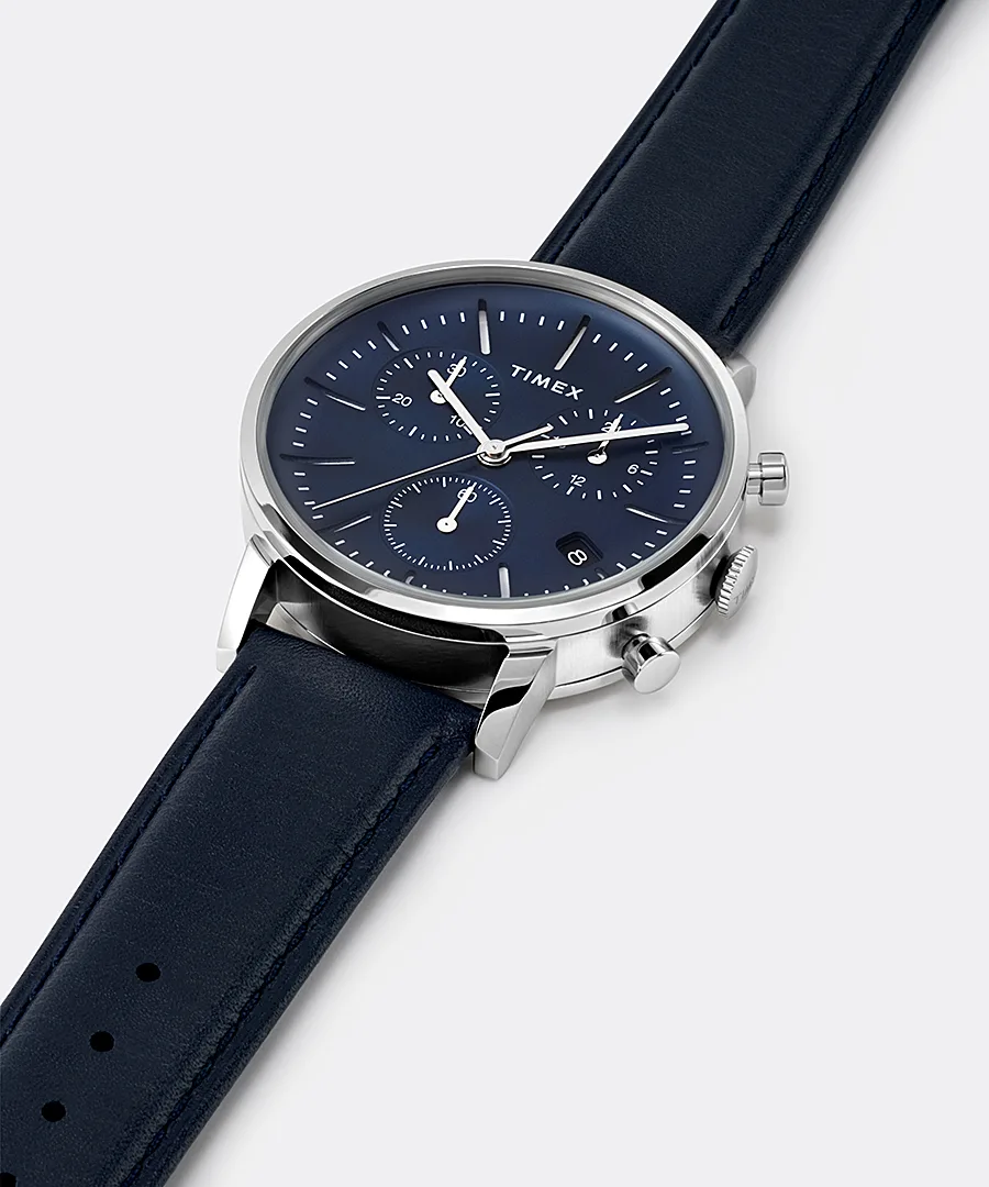 Refined and modern, the Timex Midtown Chronograph 40mm Leather Strap Watch TW2V36800 blends timeless design with urban sophistication. This men’s watch features a striking concave blue dial with full markers and a brushed finish, encased in polished stainless steel for a sleek and durable appearance. The chronograph layout and date display at 4 o’clock enhance its functionality without compromising its minimalist charm. A smooth blue leather strap offers comfort and an elegant finish, secured with a classic buckle and quick-release spring bars for effortless style changes. With a 40mm case, mineral glass crystal, and 50-meter water resistance, this timepiece stands out in the watches category for its balance of craftsmanship, performance, and everyday versatility.