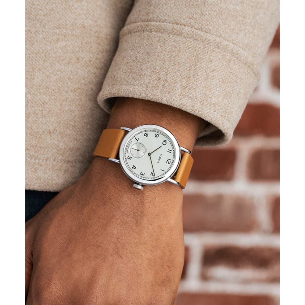 With its careful attention to detail, the Timex Standard shines as one of our most refined everyday watches. This timepiece is designed with versatility in mind, bringing together classic elements with modern materials, including an easily interchangeable brown leather strap crafted from repurposed apple skin. The beautiful, vertically brushed pale gold-tone dial, traditional sub second, and legible Arabic indices bring both nautical and military-inspired flair to your favorite casual watch.