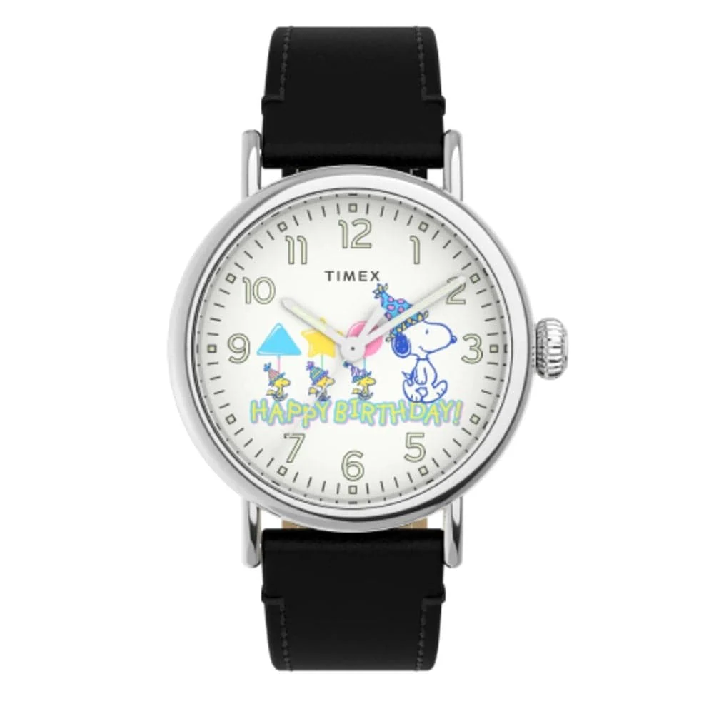 Happy birthday to you! Our most refined everyday watch meets our favorite Peanuts pup. We updated our versatile Timex Standard—pairing the silver-tone case and black leather strap with our pal Snoopy on the dial to celebrate your special day.