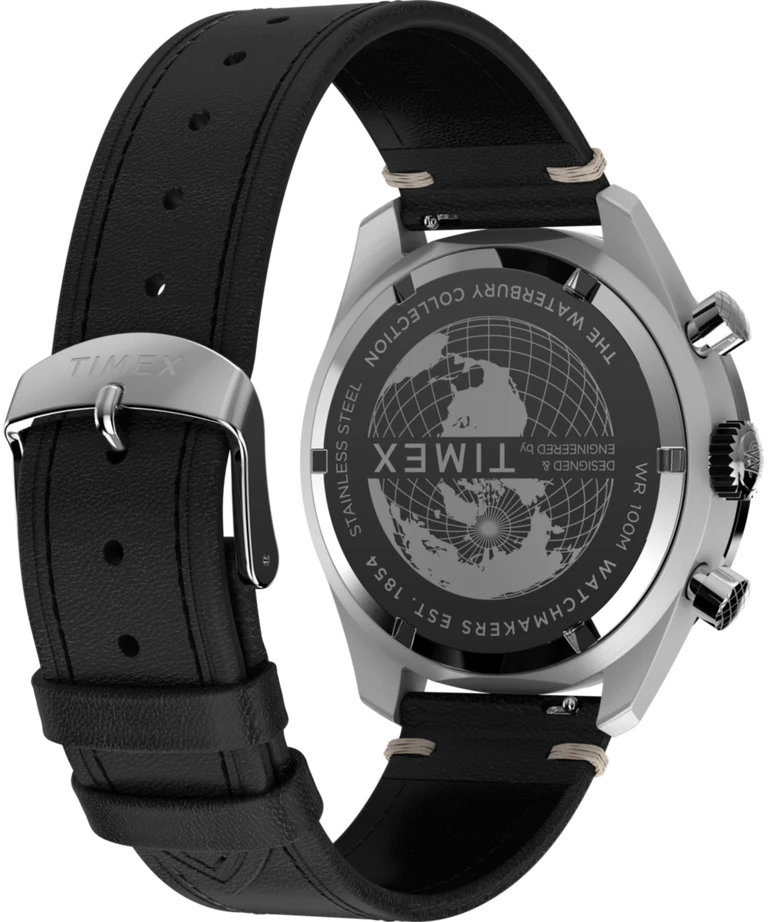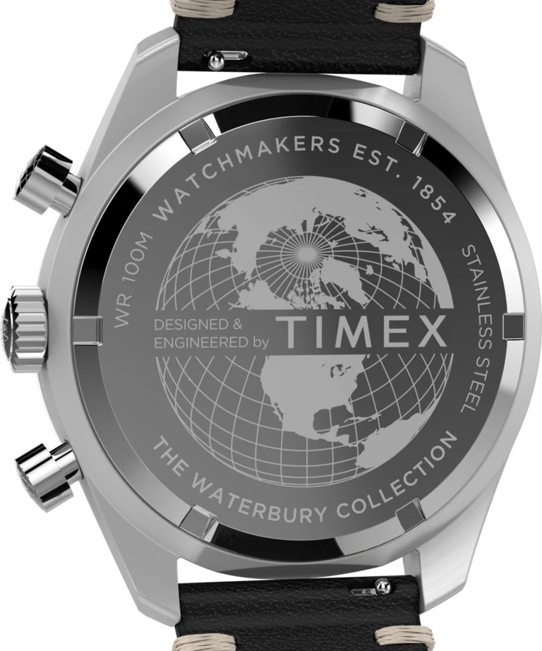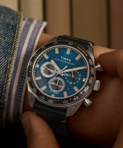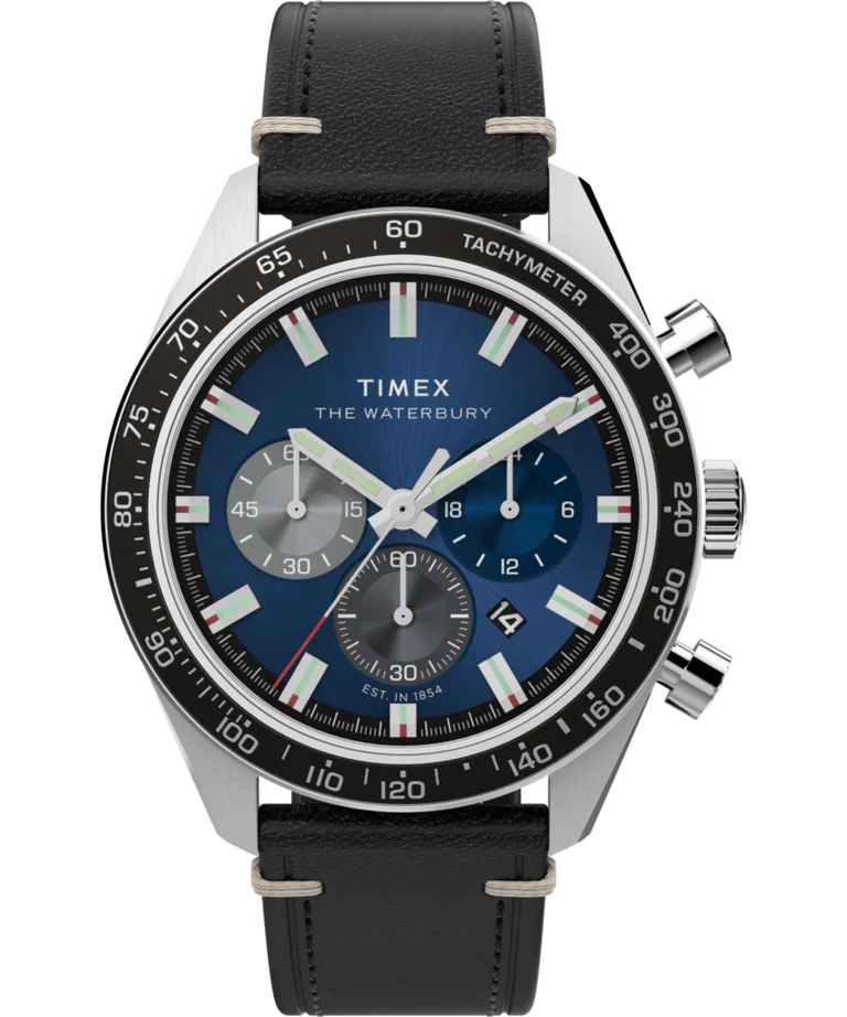 The Timex Waterbury Chronograph Leather Strap Watch TW2Y18600 exemplifies timeless elegance and modern versatility, crafted with a brushed stainless steel 41mm case and a rich blue dial. The chronograph features three tonal sub-dials and clear markers, complemented by bold red accents for refined readability. Its mineral glass lens and precision quartz movement ensure lasting durability, while the tachymeter bezel adds a touch of athletic sophistication. The sustainably sourced black leather strap, finished with contrast stitching and quick-release spring bars, offers style and comfort. With 100 meters water resistance and a discreet date window, this men’s watch is perfectly suited for both everyday wear and occasions that demand a distinguished touch in the watches category.