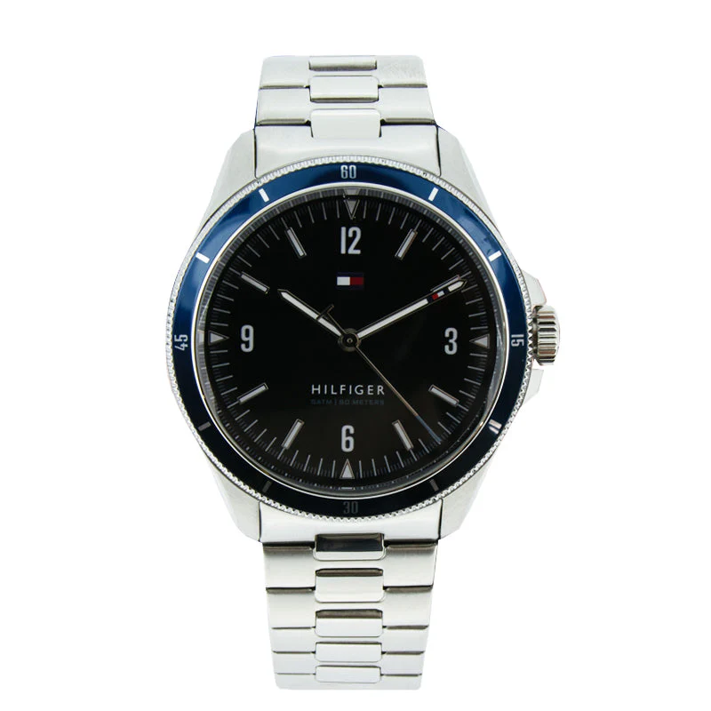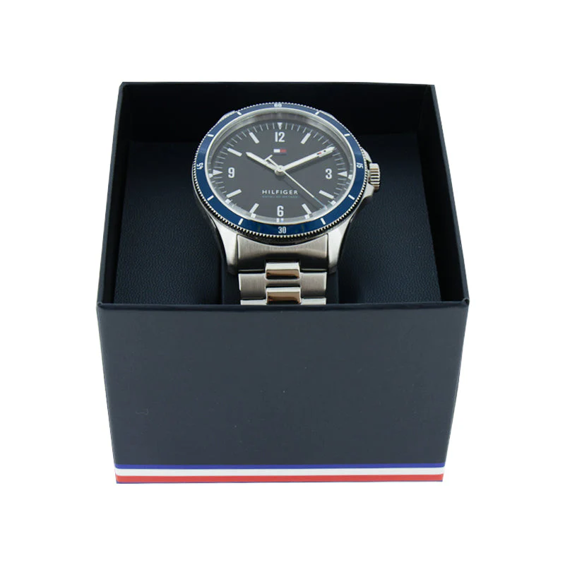 Sleek Tommy Hilfiger watch for men, crafted with stainless steel and a striking silver case featuring a stylish blue bezel.