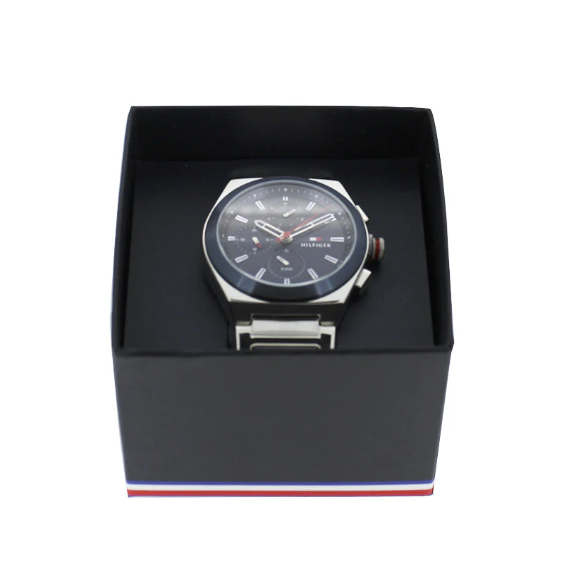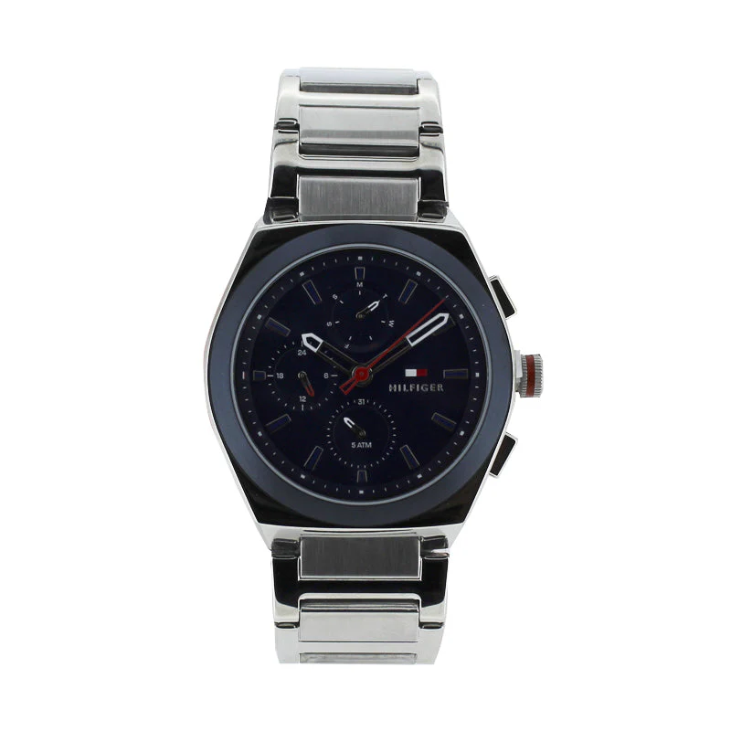Stylish men’s Tommy Hilfiger watch. With its stainless steel case, silver strap, and blue dial, this analogue timepiece features a chronograph, quartz movement, and 50M water resistance. Complete with a 44mm case and folding clasp.