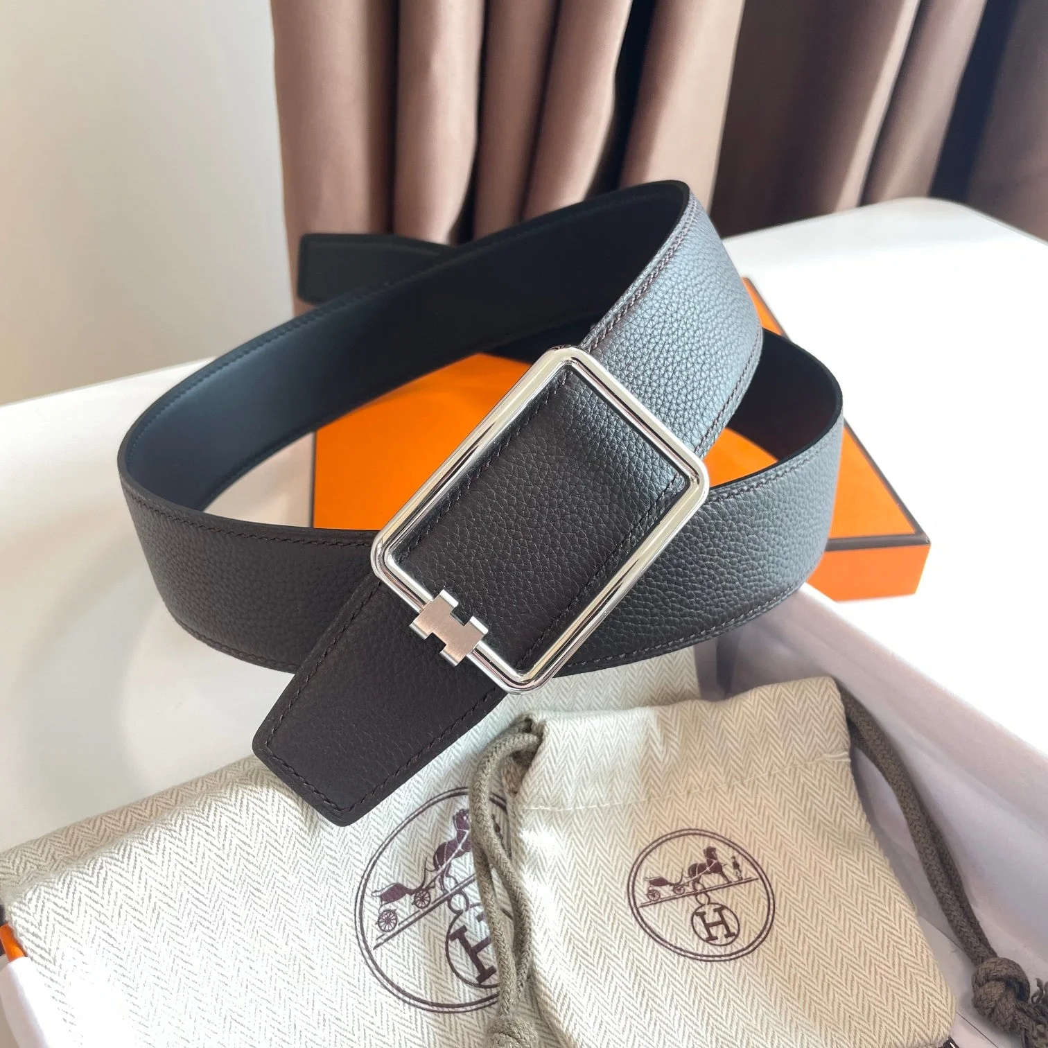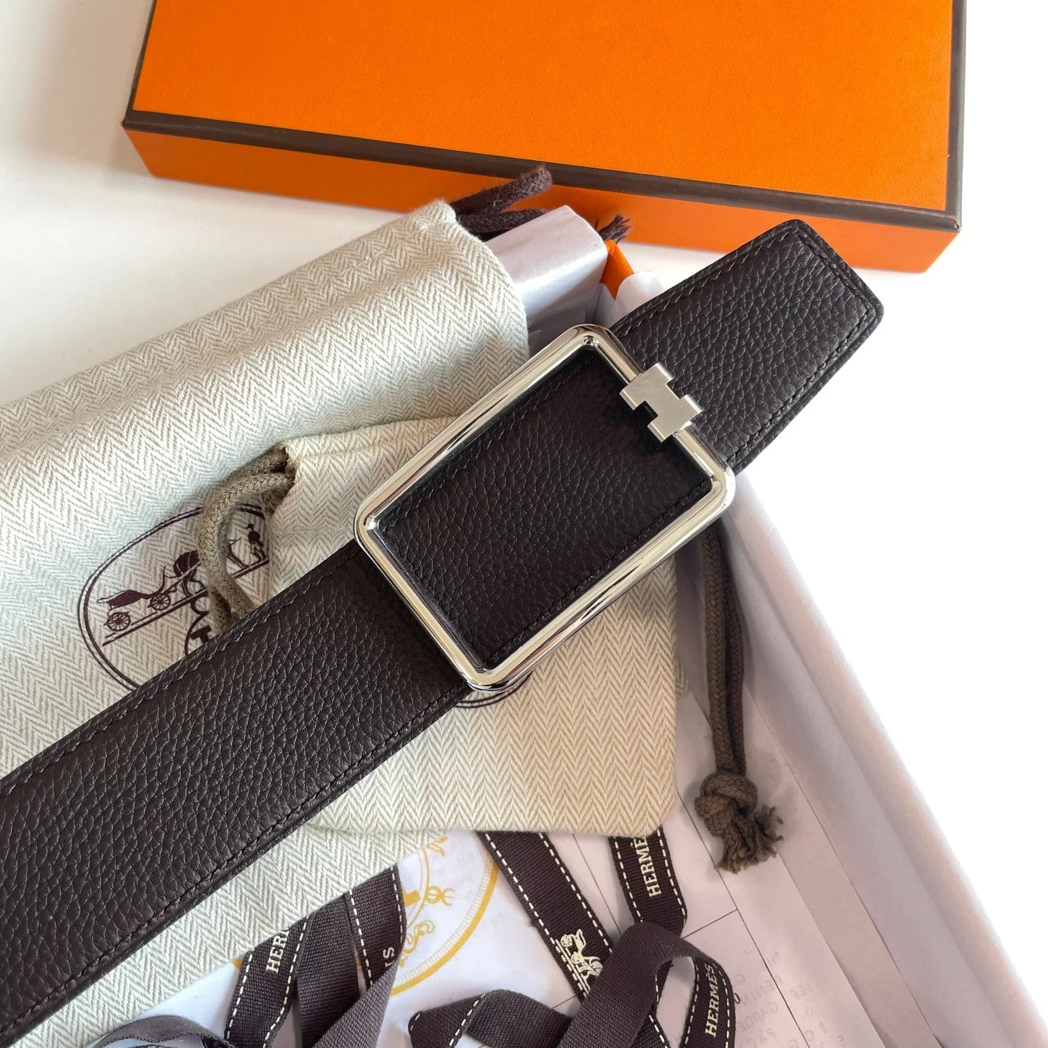 TUBE H BELT SILVER BUCKLE & REVERSIBLE DARK BROWN LEATHER STRAP 38MM