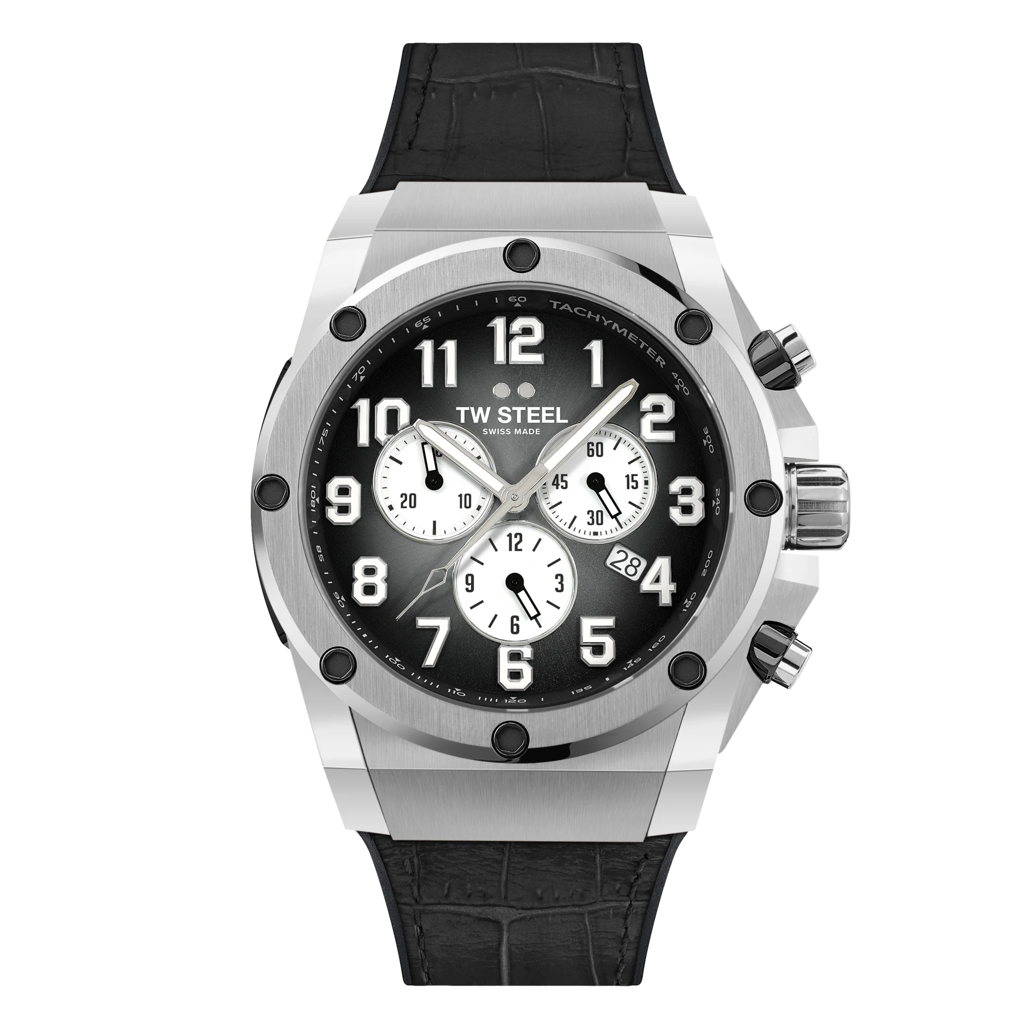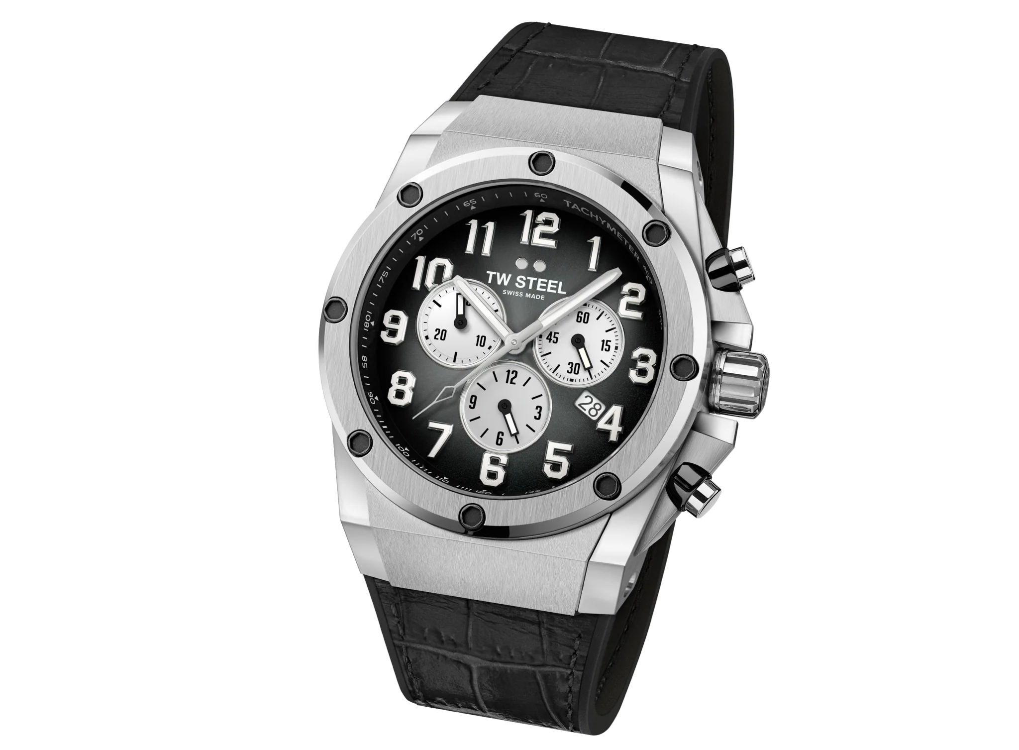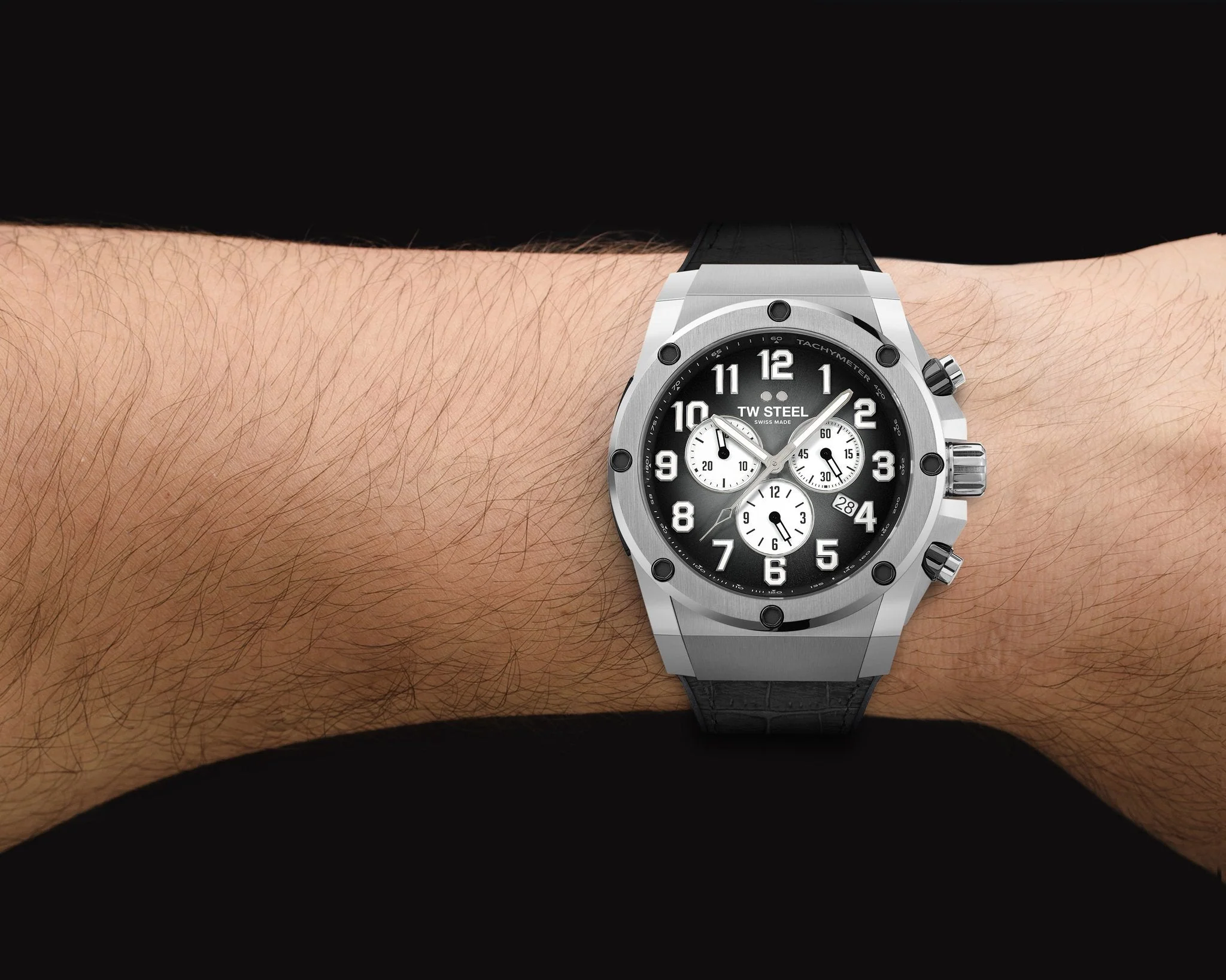 This limited edition offers the highest quality at an exceptional price. The Swiss made ACE130 is powered by a Swiss made chronograph and features anti-reflection sapphire crystal, a luxury croco-print black leather on black soft rubber strap and five year worldwide warranty.