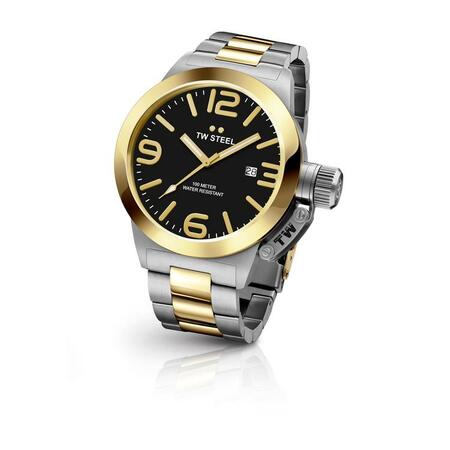 TW Steel CB42 Canteen Bracelet men’s watch features a 50mm wide and 14mm thick two tone yellow gold plated solid stainless steel case with a fixed bezel and textured cap covered hook protected push-pull crown. TW Steel CB42 is powered by an attractive Miyota 2415 quartz movement. This stylish watch also features a sharp looking black dial with white accents gold tone luminous hands and hour markers along with the date display function, scratch resistant sapphire coated reinforced mineral crystal and water resistant to 100 meters. TW Steel CB42 is equipped with a 24mm wide two tone yellow gold plated solid stainless steel bracelet with a fold over push button safety lock clasp. TW Steel CB42 men’s Canteen Bracelet black dial two tone yellow gold steel watch is brand new and comes in an original TW Steel gift box and is backed by a 2 years limited warranty.