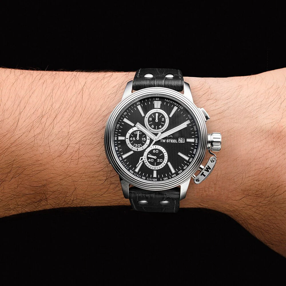 – Black dial with applied chrono rings