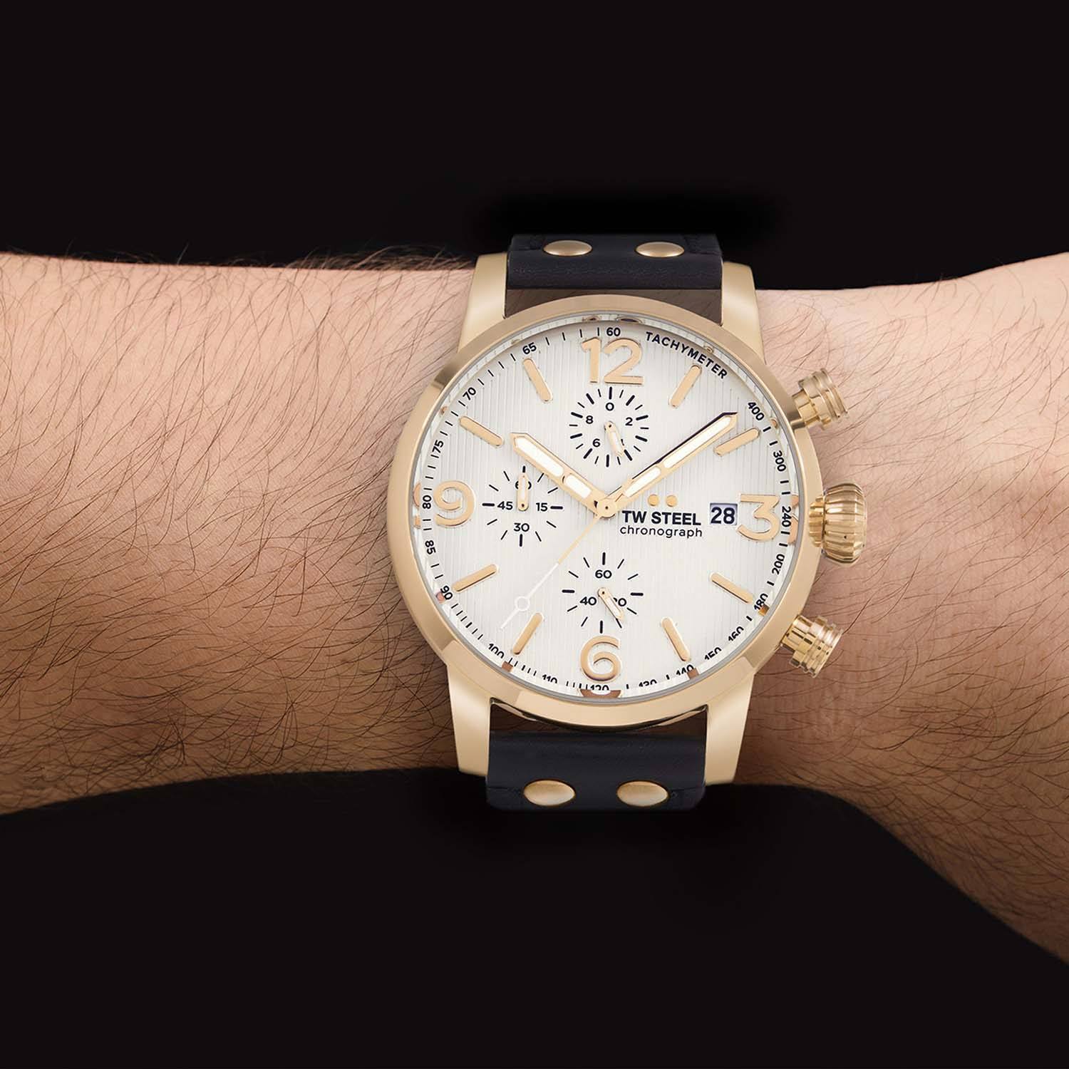 Take a modern twist on vintage style. This new Maverick features a big caliber chronograph movement, a silver white dial and a black leather strap.