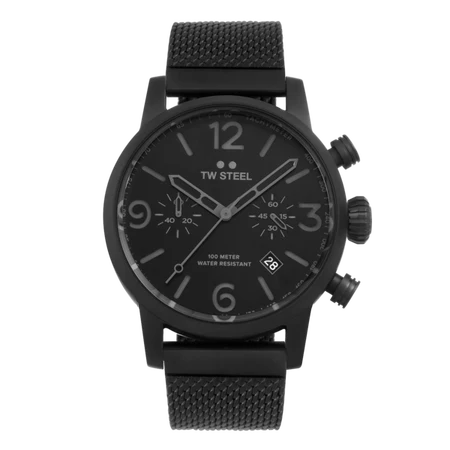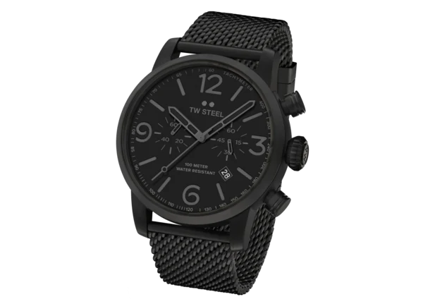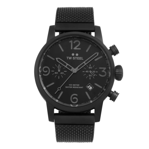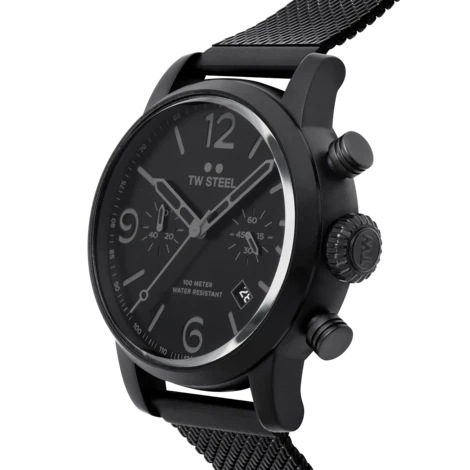 Take a modern twist on vintage style. This new Maverick features a big caliber chronograph movement, a black sandwich dial and a interchangeable black PVD coated milanese bracelet.