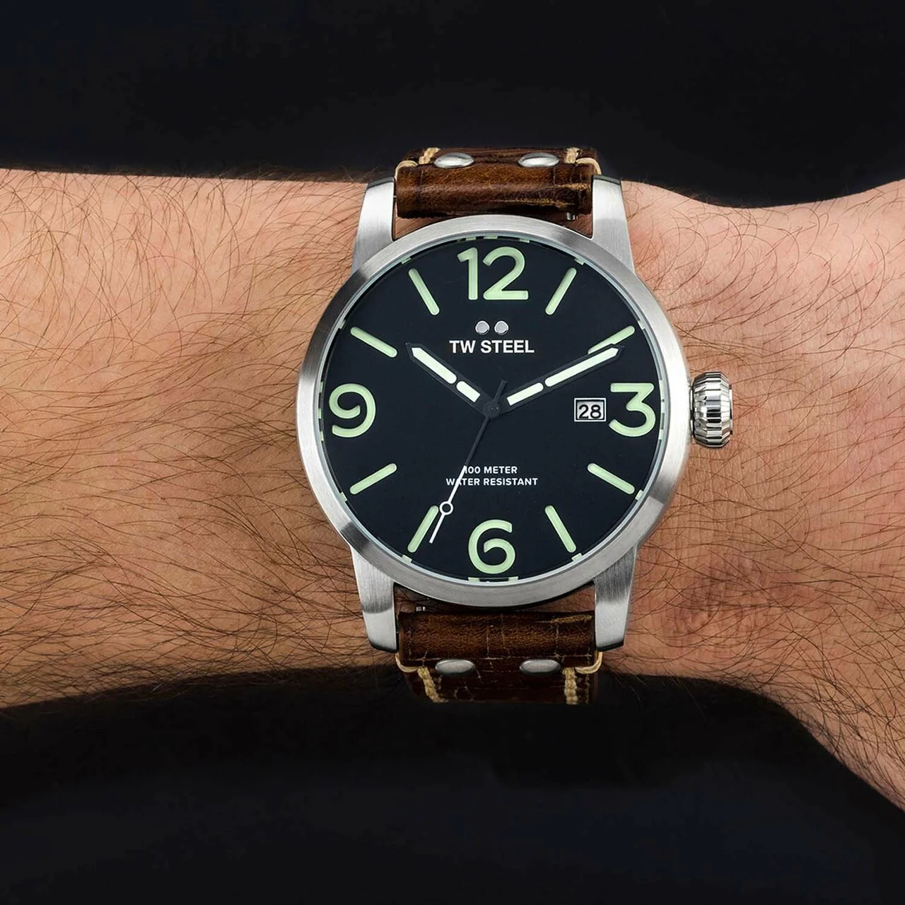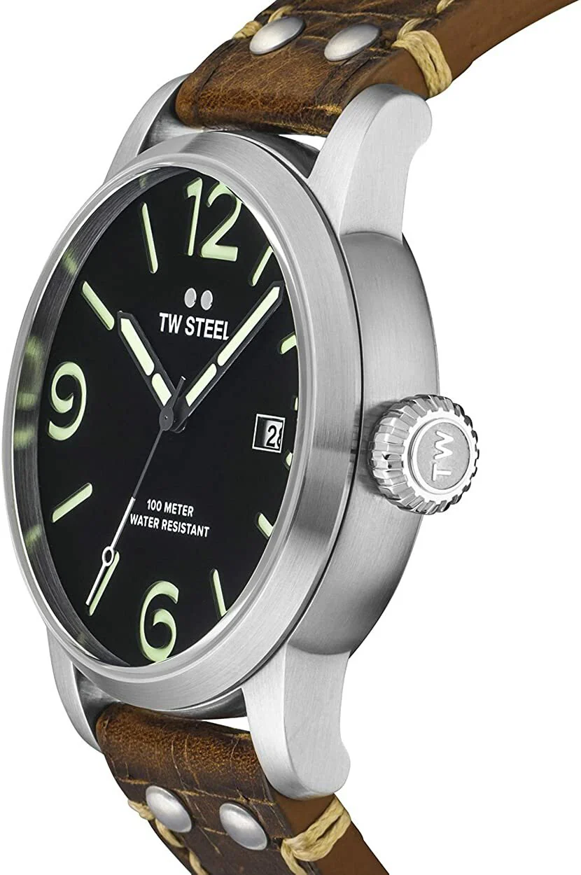 Cut loose, be bold and let the good times roll. This new Maverick features a steel case, a black sandwich dial with luminous green indexes and a walnut brown vintage leather strap with Quick Change Construction.